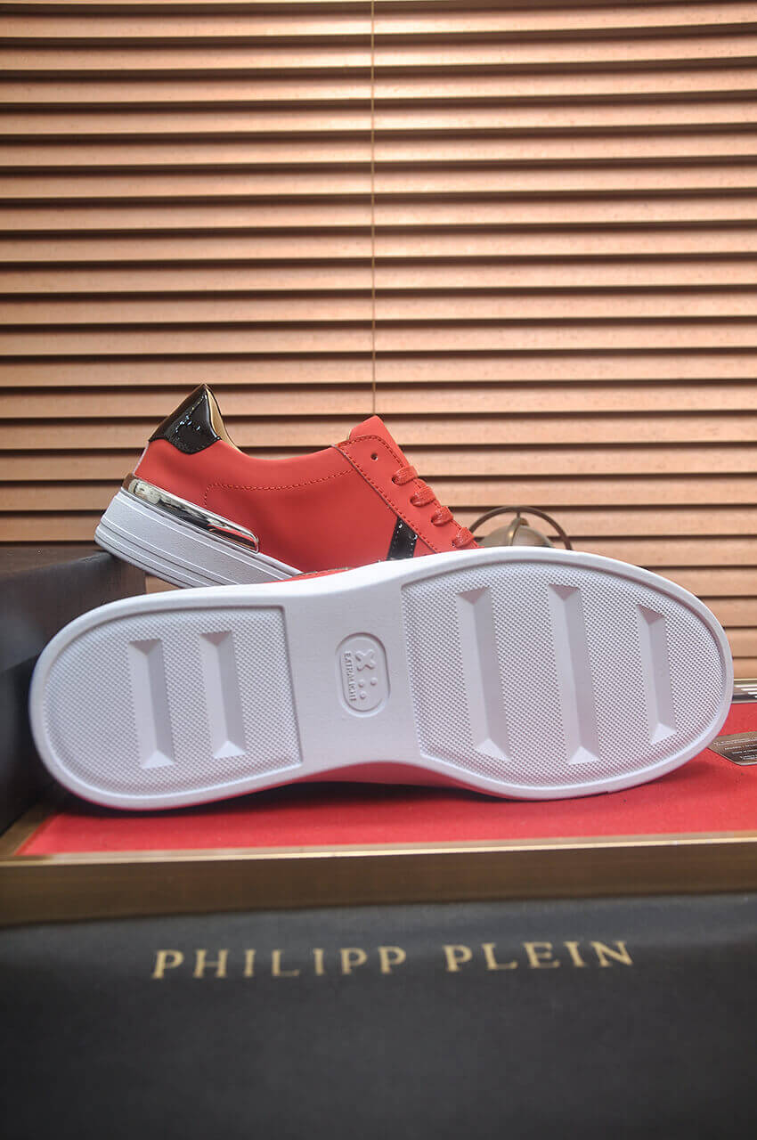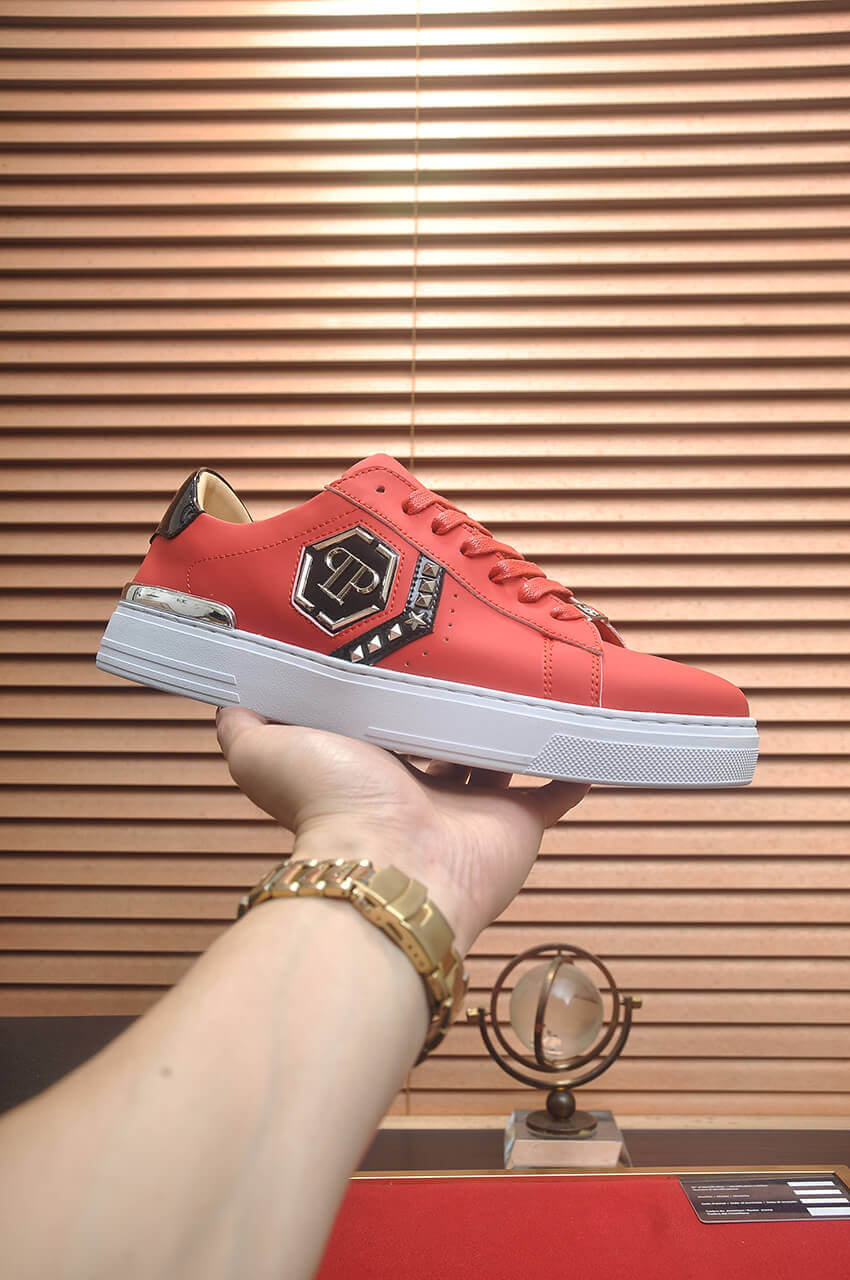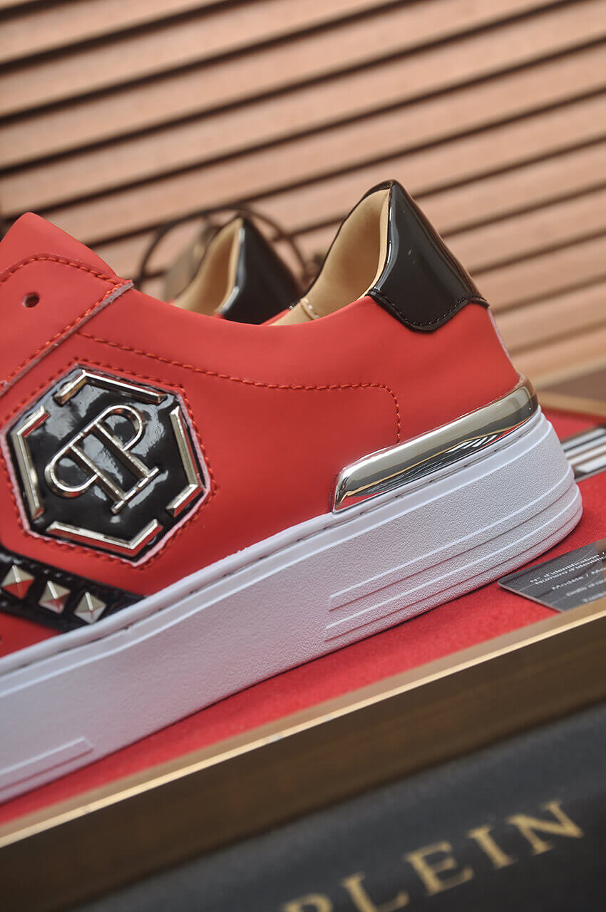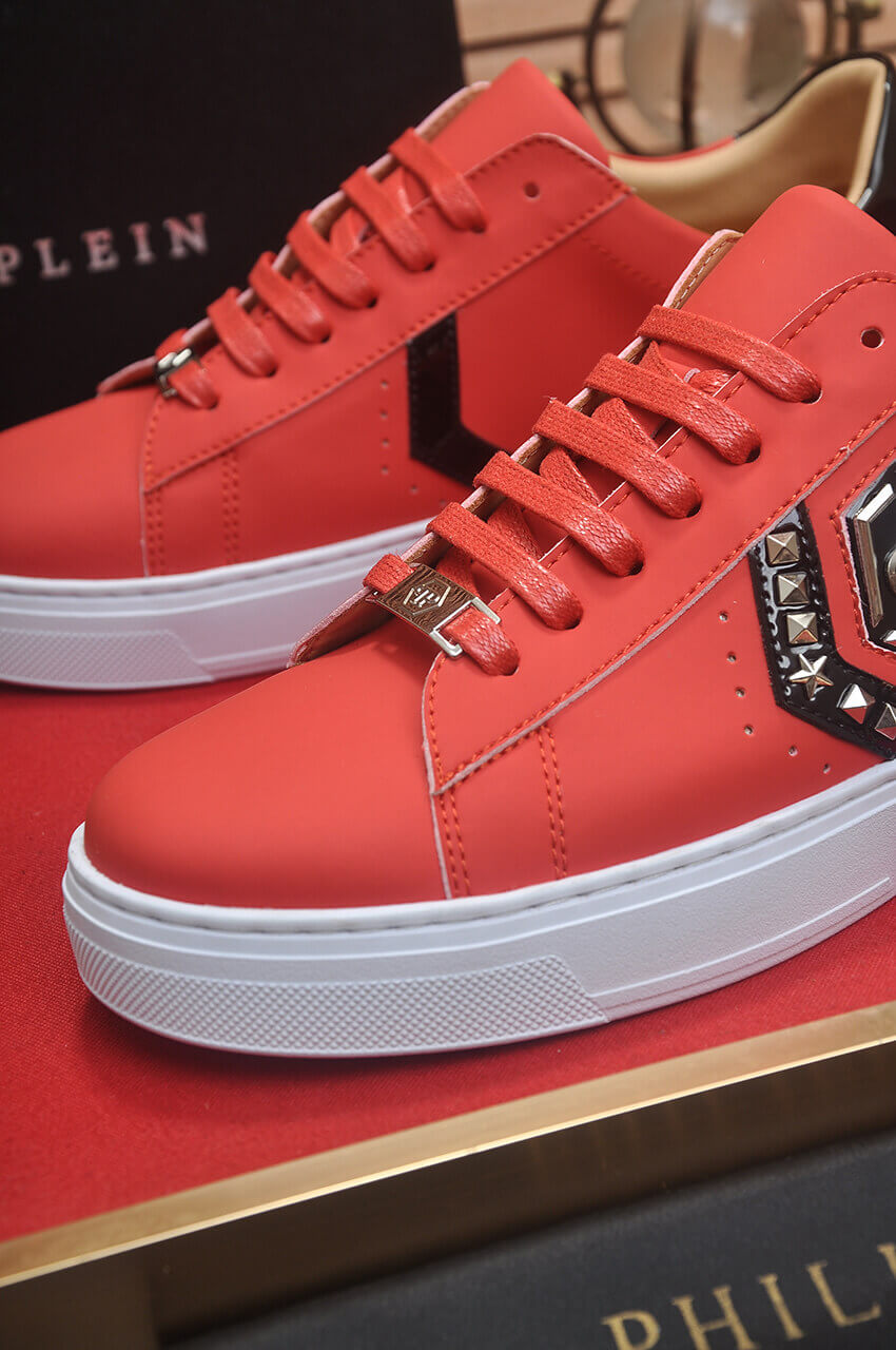 Embrace a bold aesthetic with the Philipp Plein Red Lo-Top Leather Arrow Force Sneakers with Black Detail. This desirable pair combines vibrant color with luxurious materials and striking accents, making them a standout piece for the modern wardrobe.