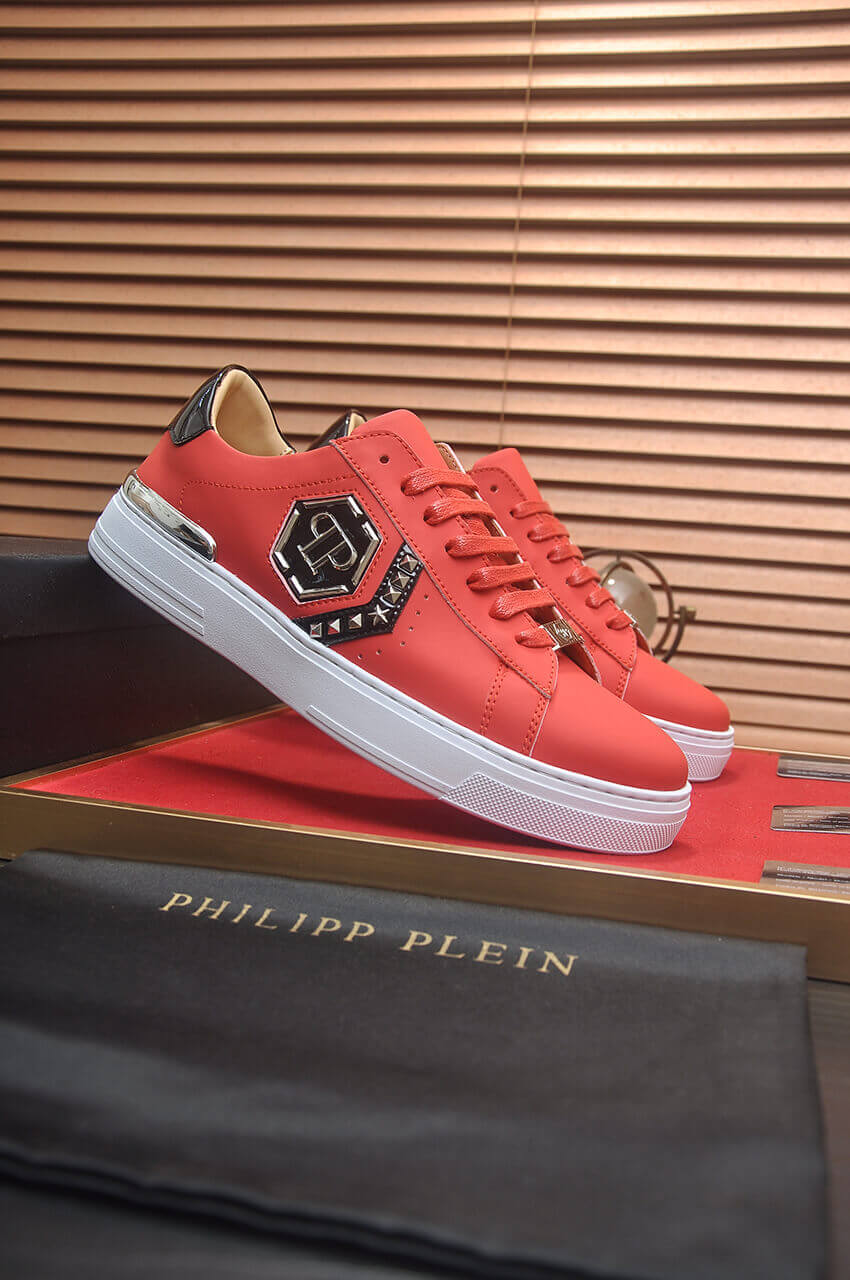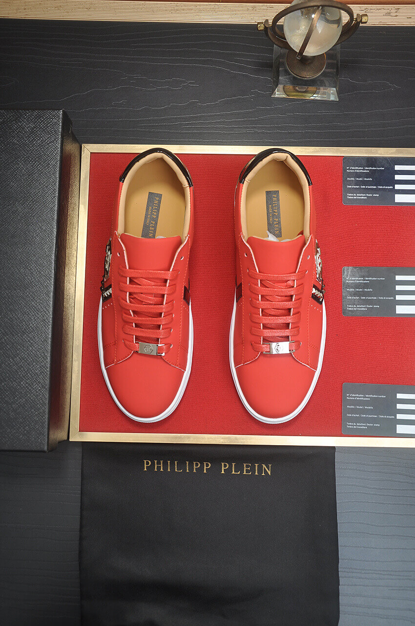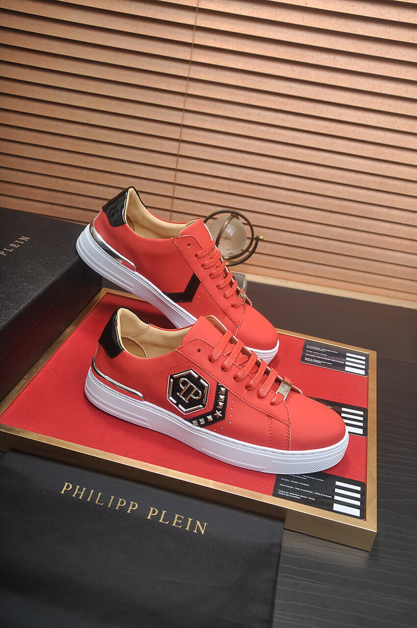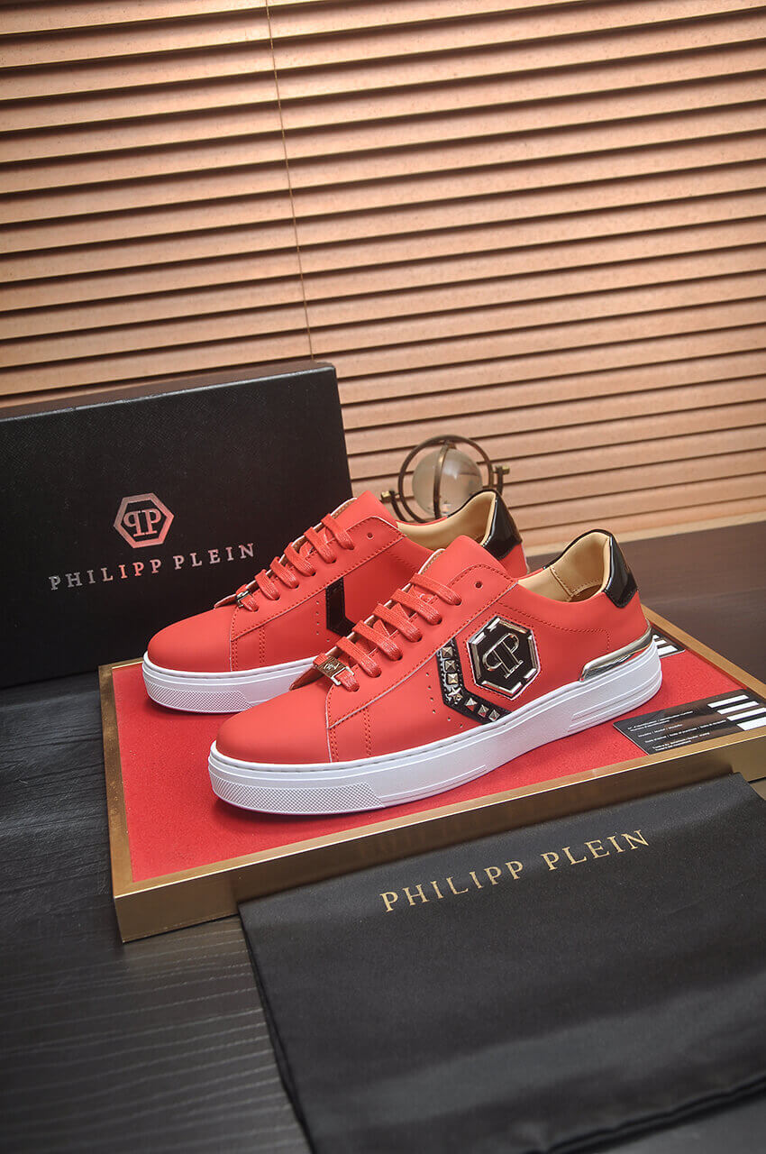 Embrace a bold aesthetic with the Philipp Plein Red Lo-Top Leather Arrow Force Sneakers with Black Detail. This desirable pair combines vibrant color with luxurious materials and striking accents, making them a standout piece for the modern wardrobe.