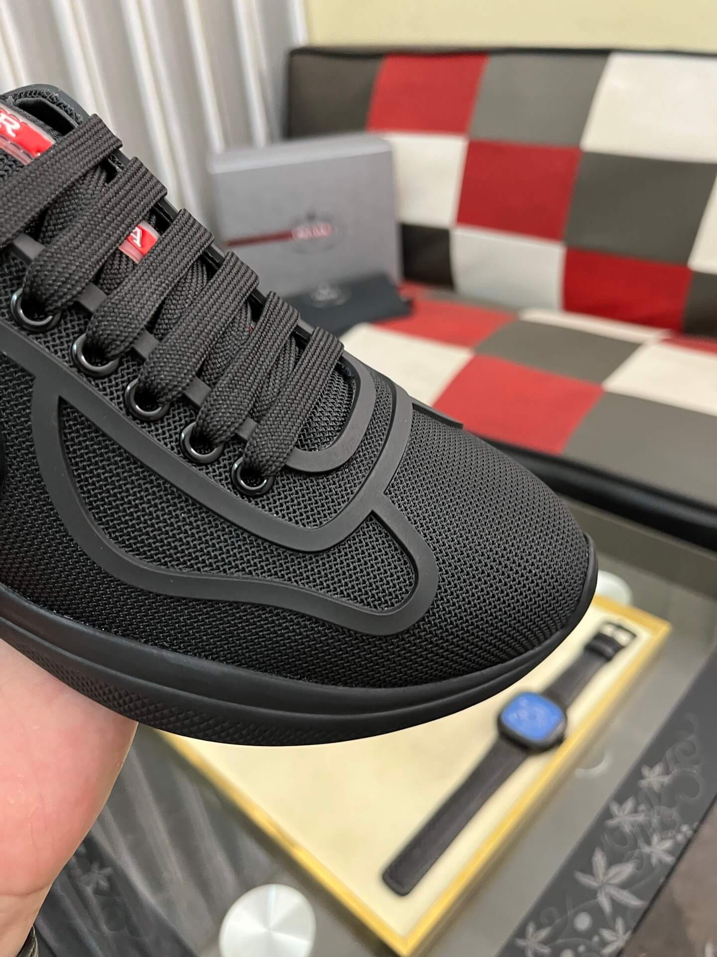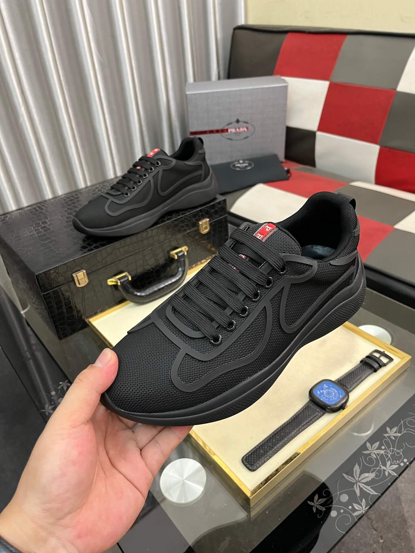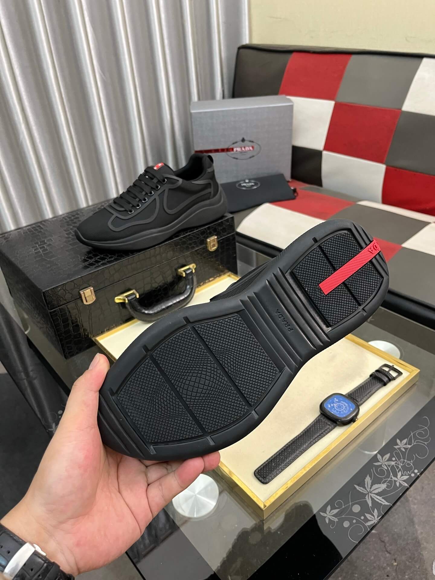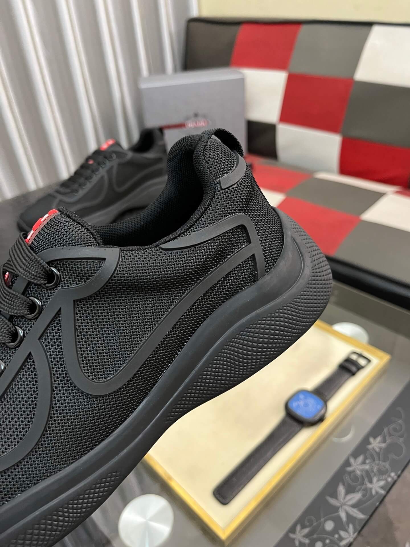 The Prada America’s Cup sneaker in black is a timeless investment, a testament to the House’s ability to create pieces that are both functional and fashionable. The monochromatic color palette enhances its refined lines and modern paneling, making it a powerful and versatile statement piece. Whether you’re navigating city streets or a casual evening out, this sneaker is the ultimate blend of minimalist luxury and technical innovation.