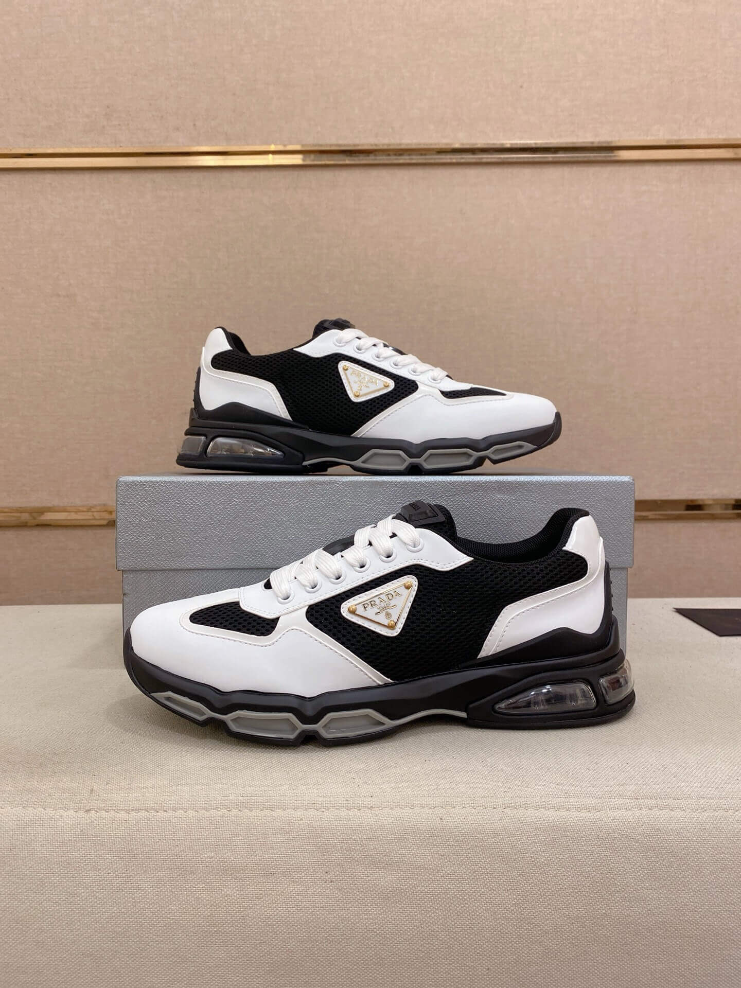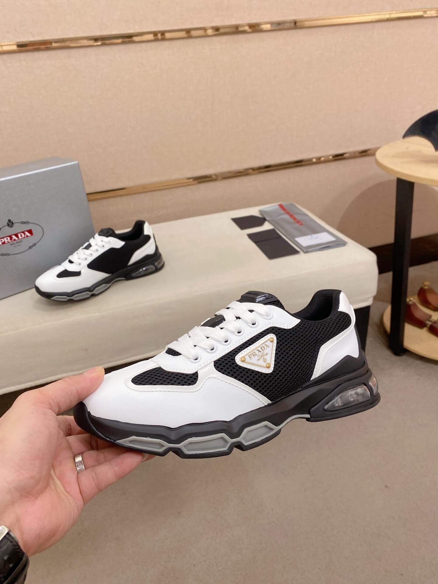 Design: These low-top sneakers feature a classic lace-up front with white laces, a padded collar, and a substantial sole. The iconic Prada triangle logo is prominently displayed on the side panel.
