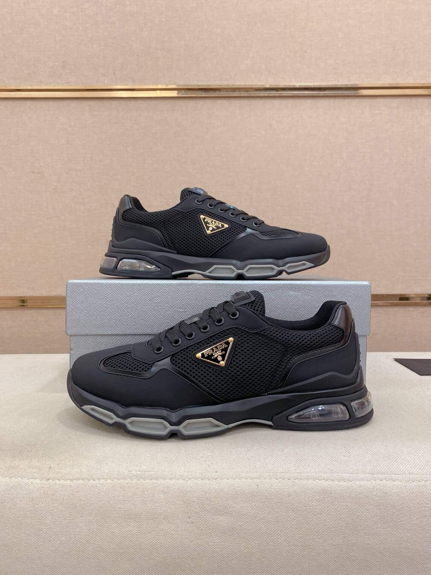 Design: These low-top sneakers feature a classic lace-up front with black laces, a padded collar, and a substantial sole. The iconic Prada triangle logo is prominently displayed on the side panel.