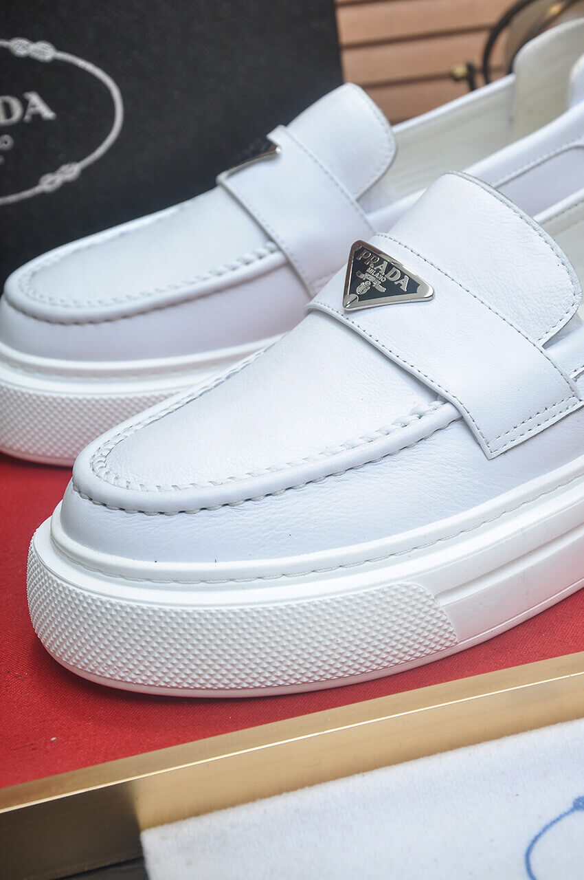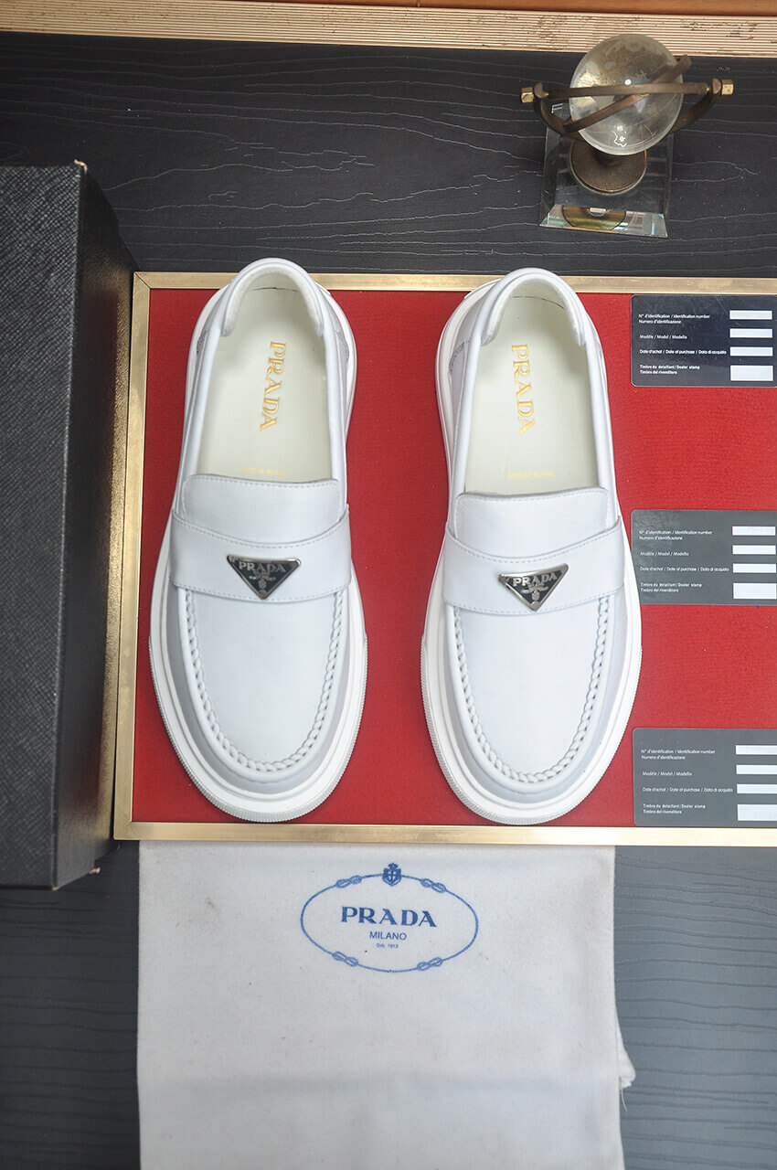 Define your style with unparalleled modern sophistication in the Prada Ivory Leather Platform Loafers with Logo Metal Plate. This highly desirable footwear flawlessly merges classic loafer aesthetics with a contemporary platform design, accented by Prada’s unmistakable signature. It’s a statement piece, crafted for those who value refined luxury and a distinct fashion forward presence.