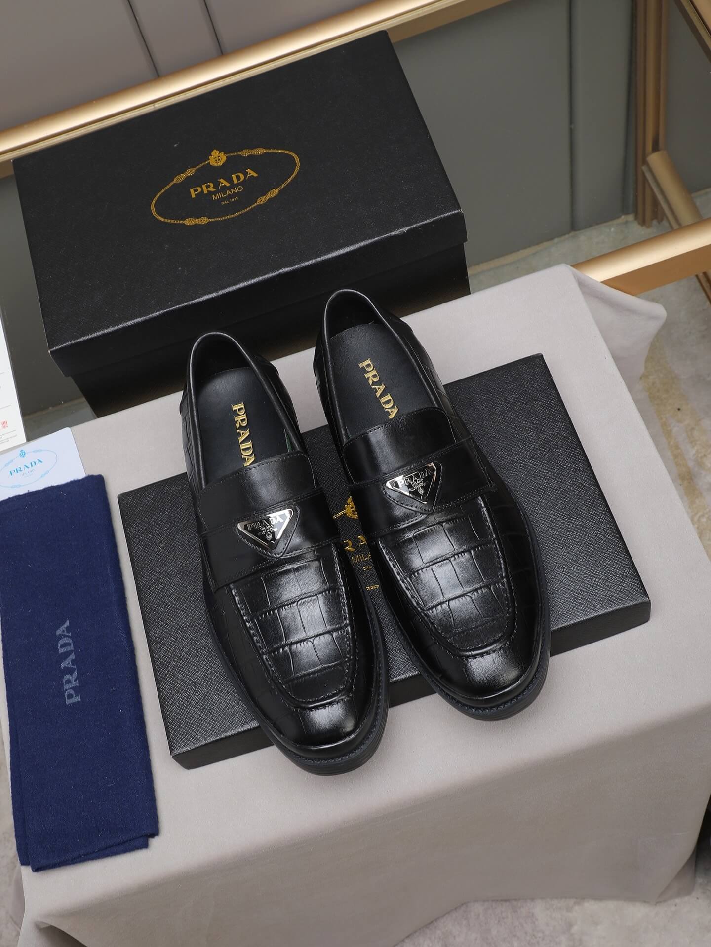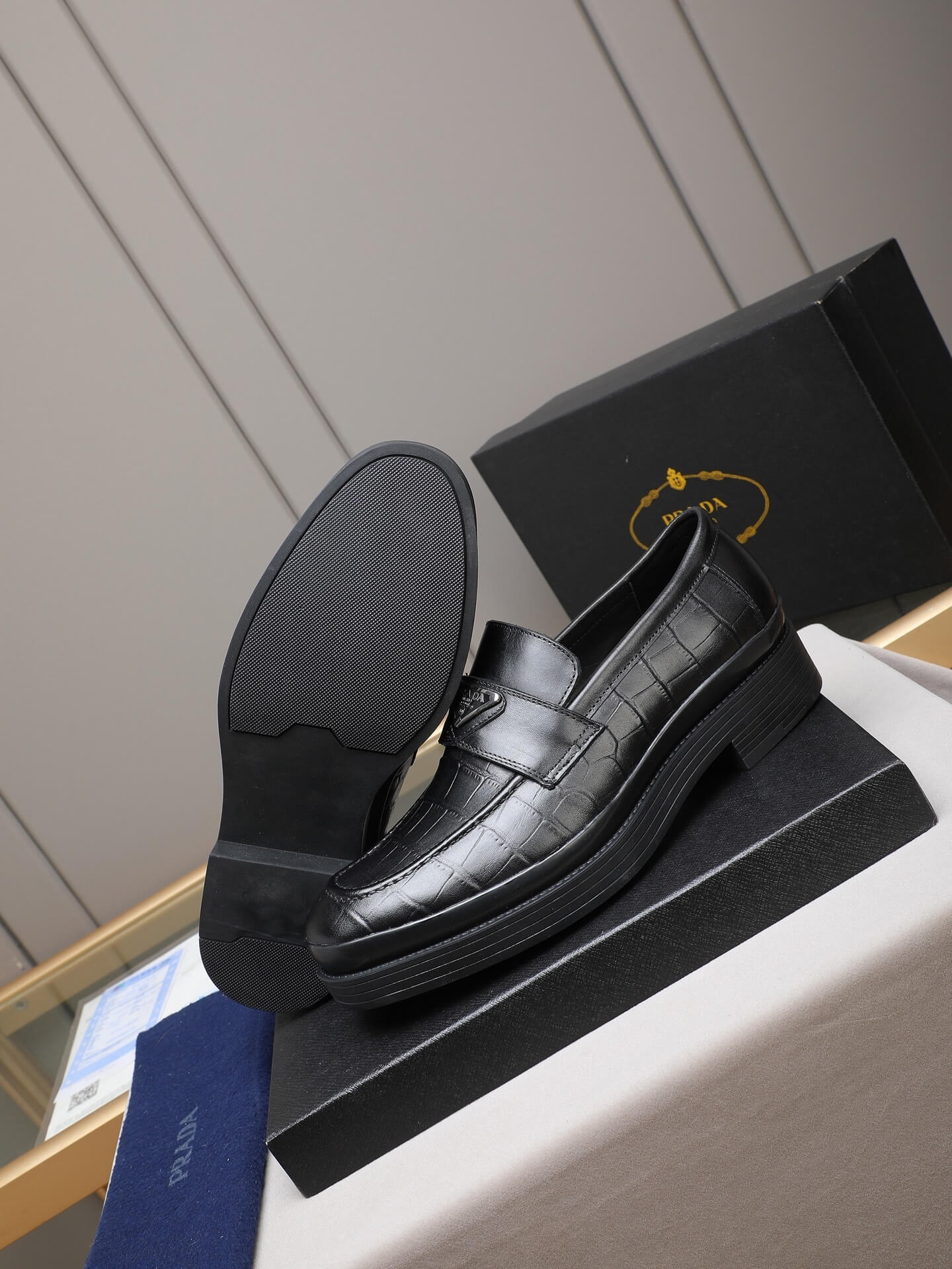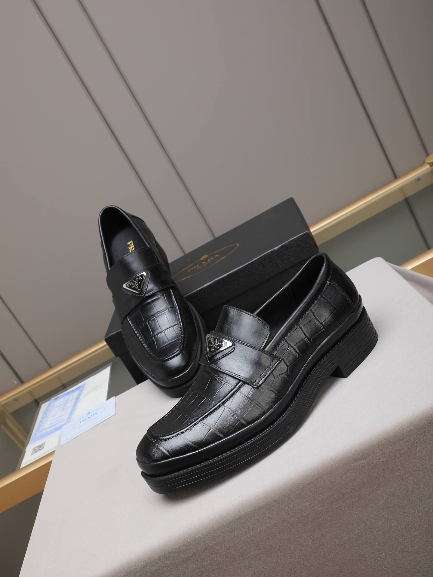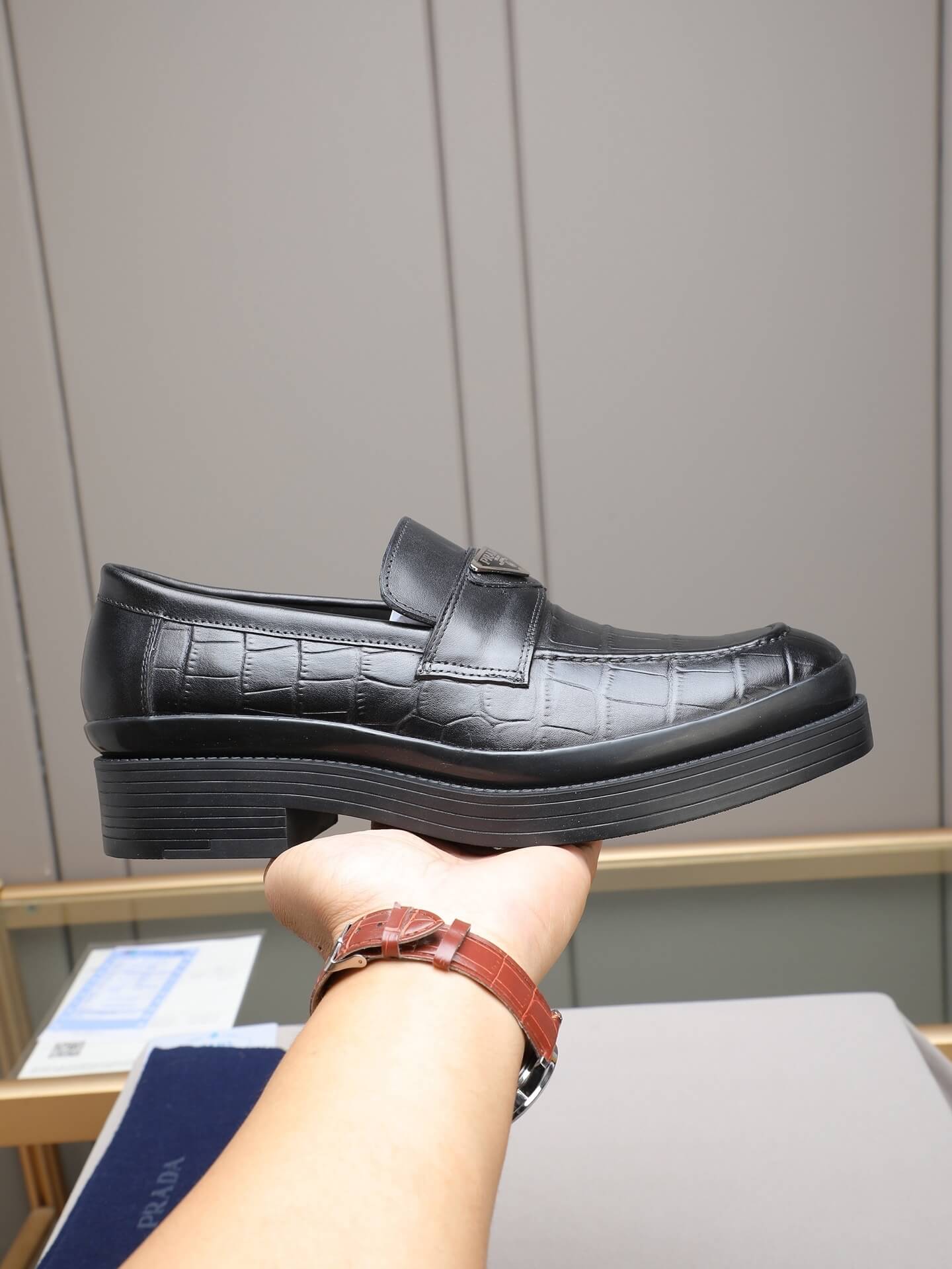 Crafted from high-shine black leather embossed with a dramatic crocodile/alligator texture, the classic penny loafer is instantly recognizable. The style is anchored by a thick, monochromatic black lug sole and punctuated by the iconic Prada logo plaque on the saddle, creating a powerful statement piece.
