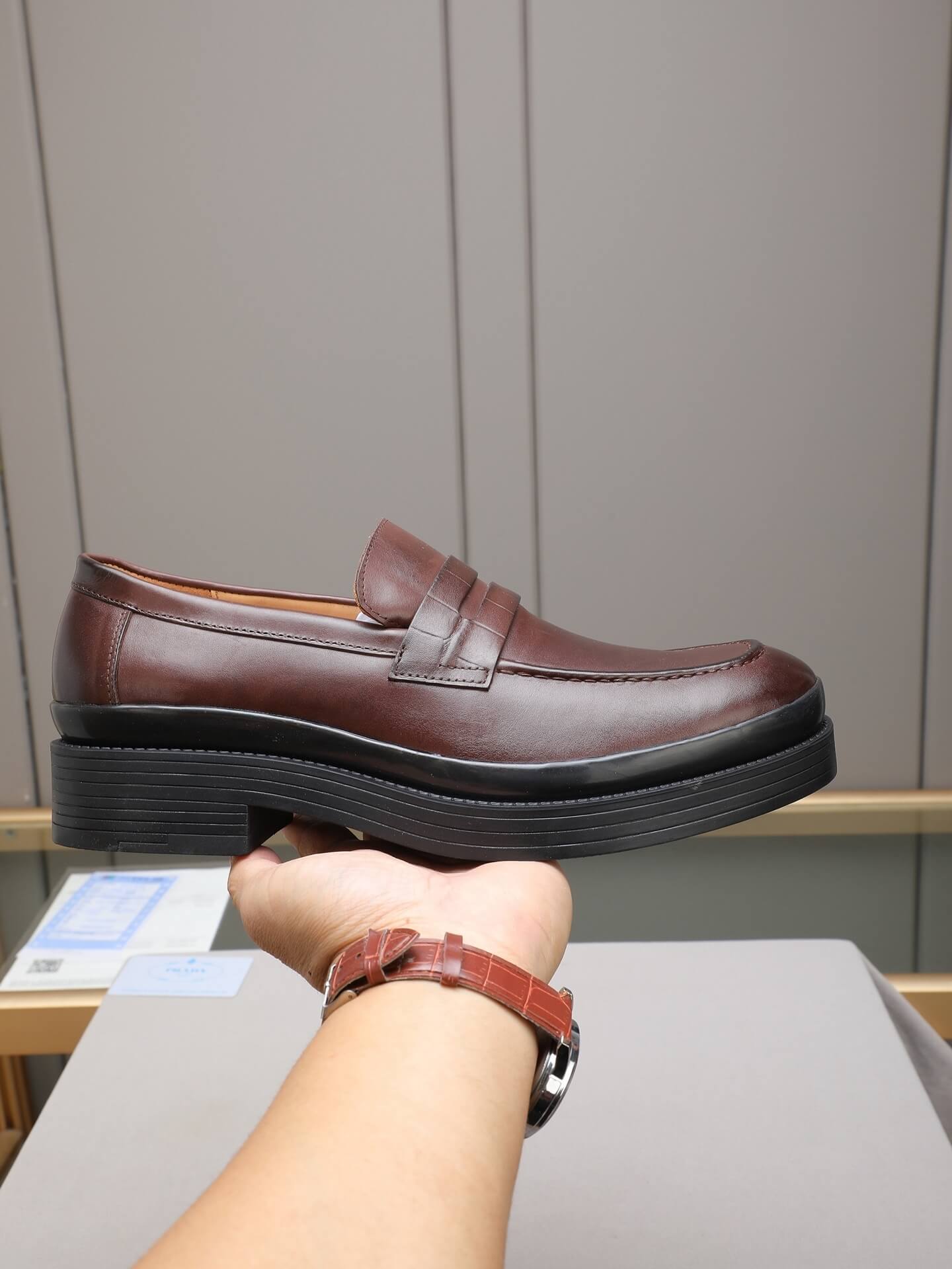 Introduce a rich, sophisticated texture to your footwear collection with the Prada Brushed Spazzolato Leather Lug Sole Loafer. This iconic style successfully merges classic collegiate charm with a powerful, contemporary structure. Crafted from flawless, dark brown brushed leather (Spazzolato), the upper has a unique, subtle sheen that elevates the color. The traditional penny loafer is dramatically modernized by a pronounced, chunky black lug sole, creating a high-contrast piece perfect for year-round luxury wear.