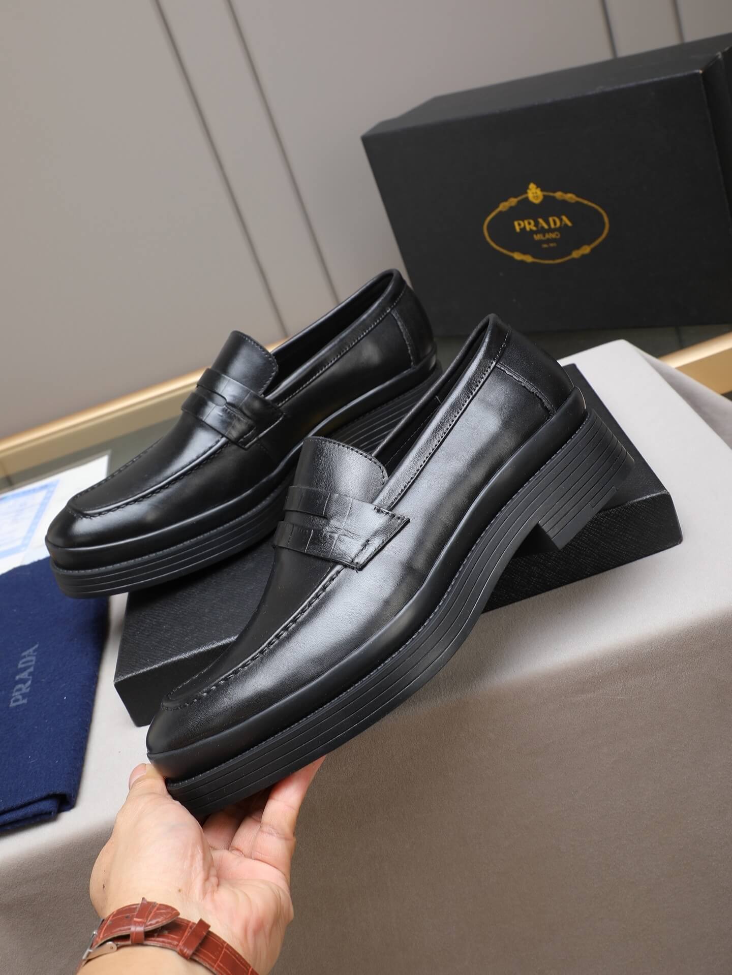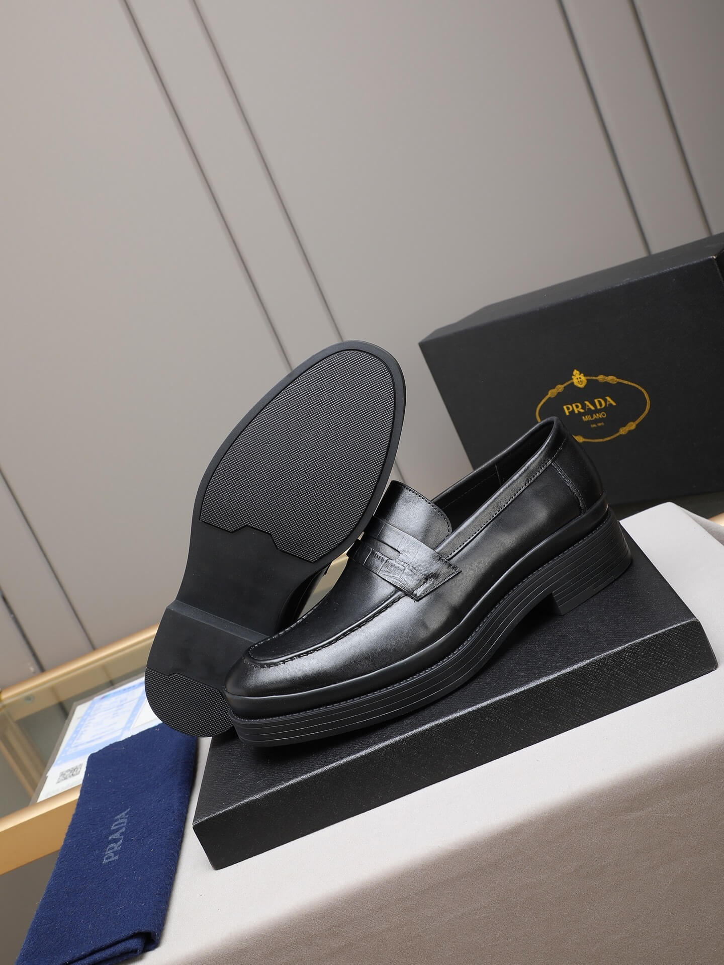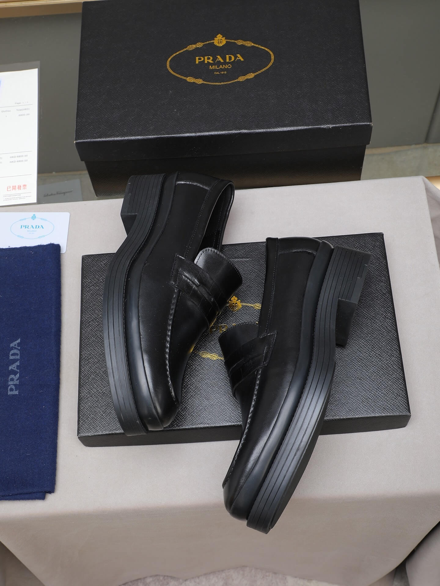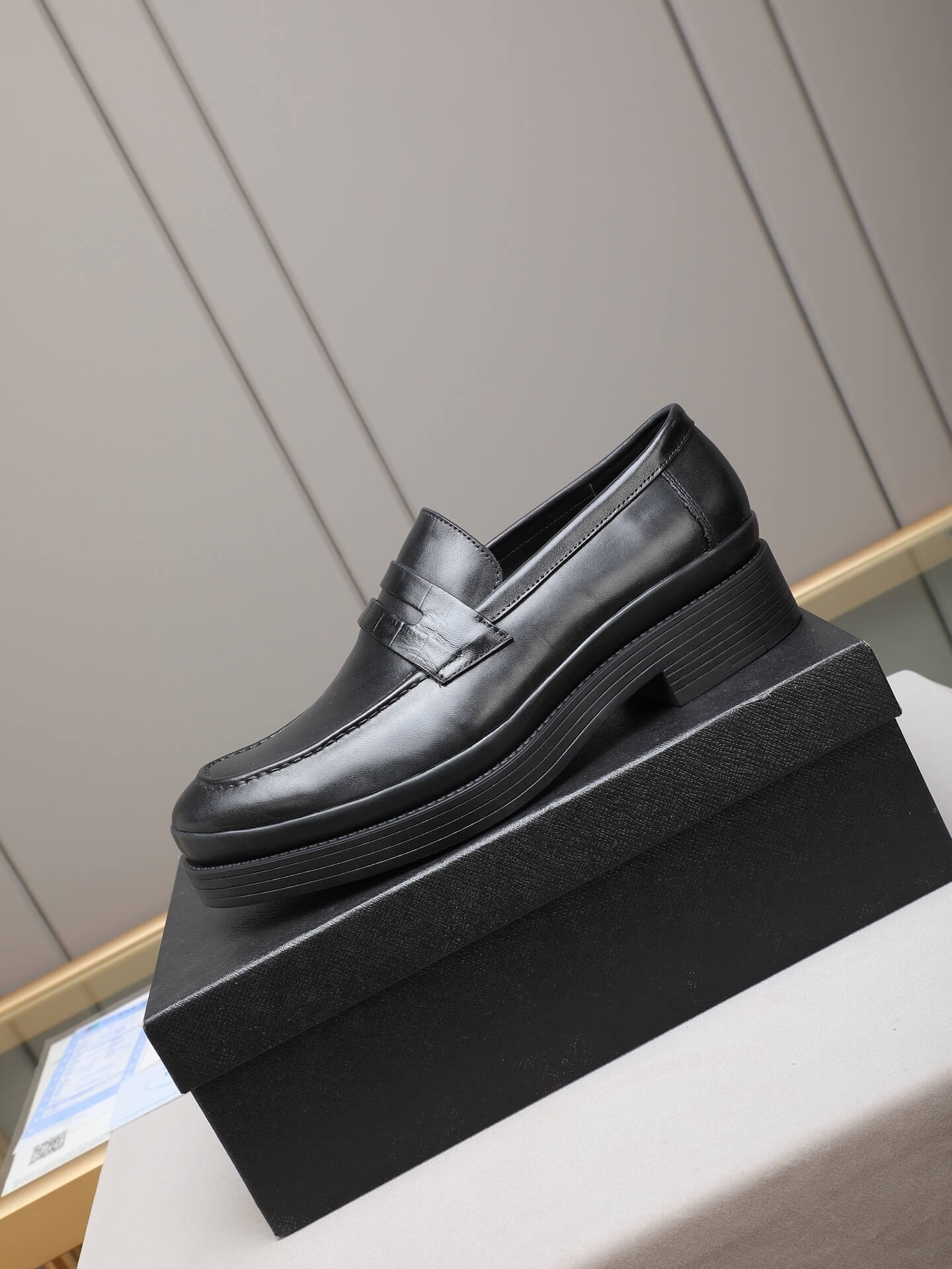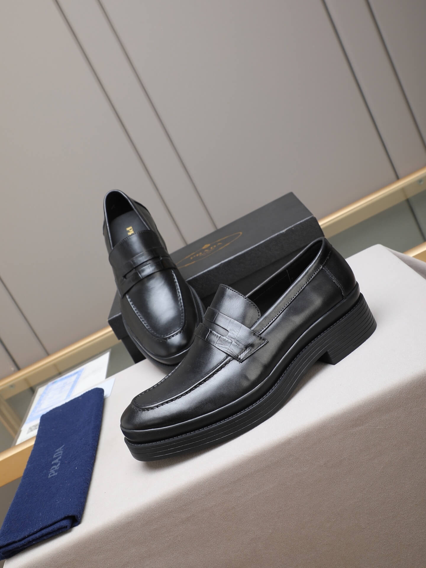 Embrace minimalist edge with the Prada Brushed Spazzolato Leather Chunky Lug Sole Loafer. This shoe is the epitome of Prada’s signature aesthetic, blending collegiate formality with a strong, modern silhouette. Crafted from flawless black brushed leather (often known as Spazzolato), the upper has a unique, subtle sheen. The classic penny loafer design is dramatically modernized by a pronounced, chunky black lug sole, creating a sophisticated monochromatic piece that dominates any smart-casual setting.