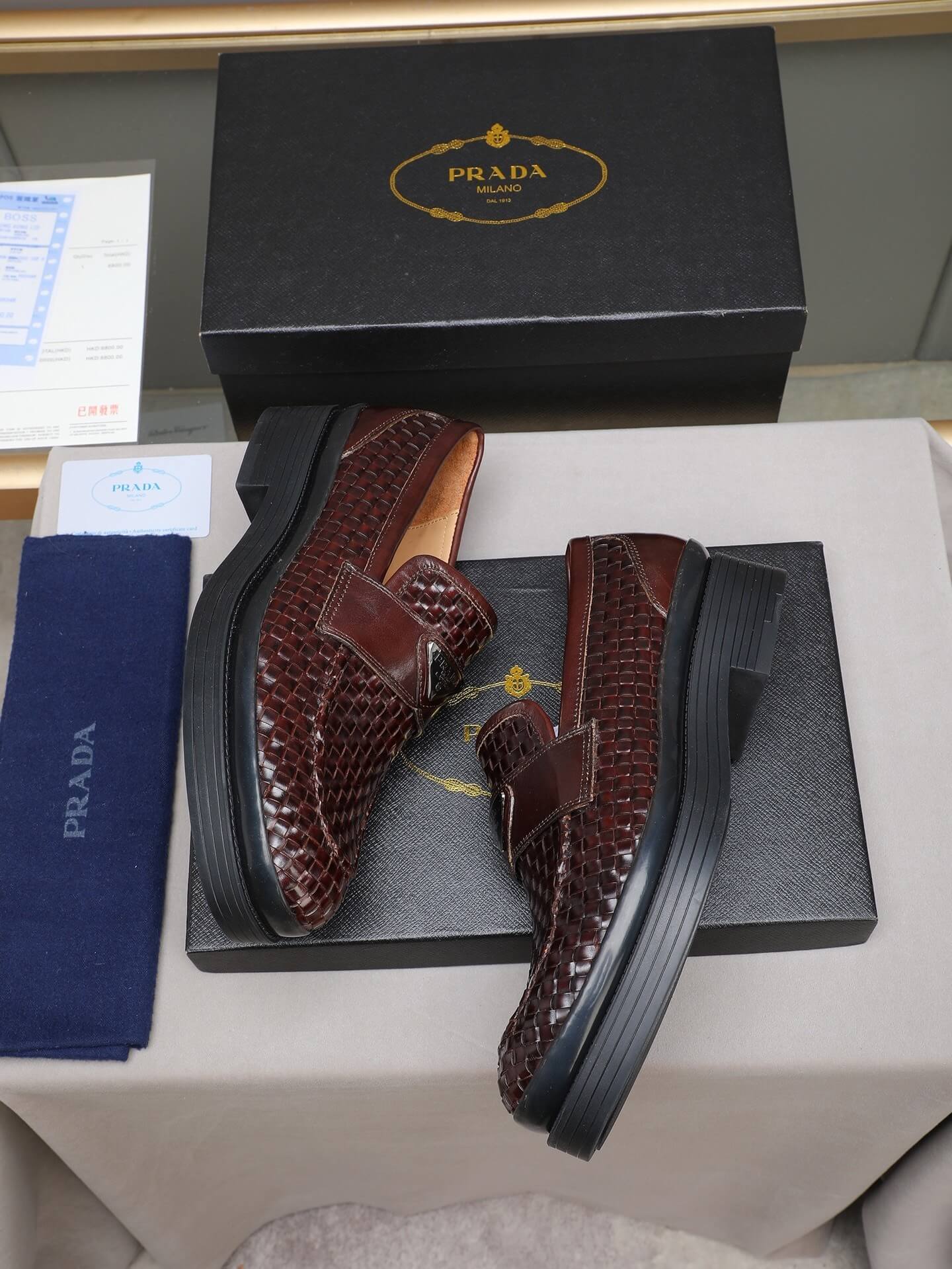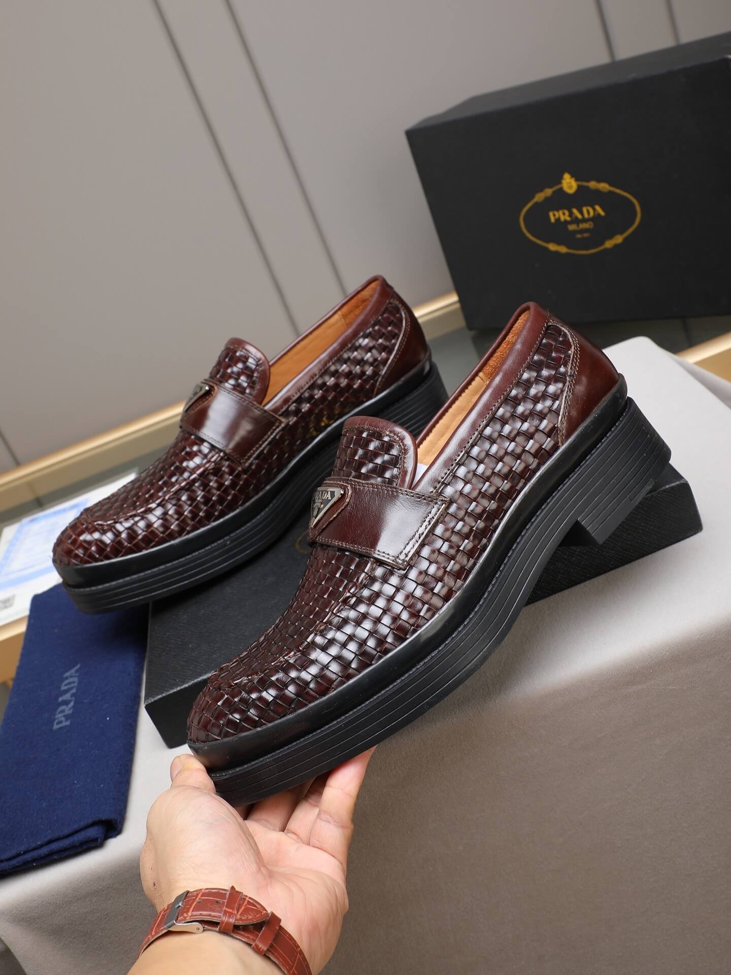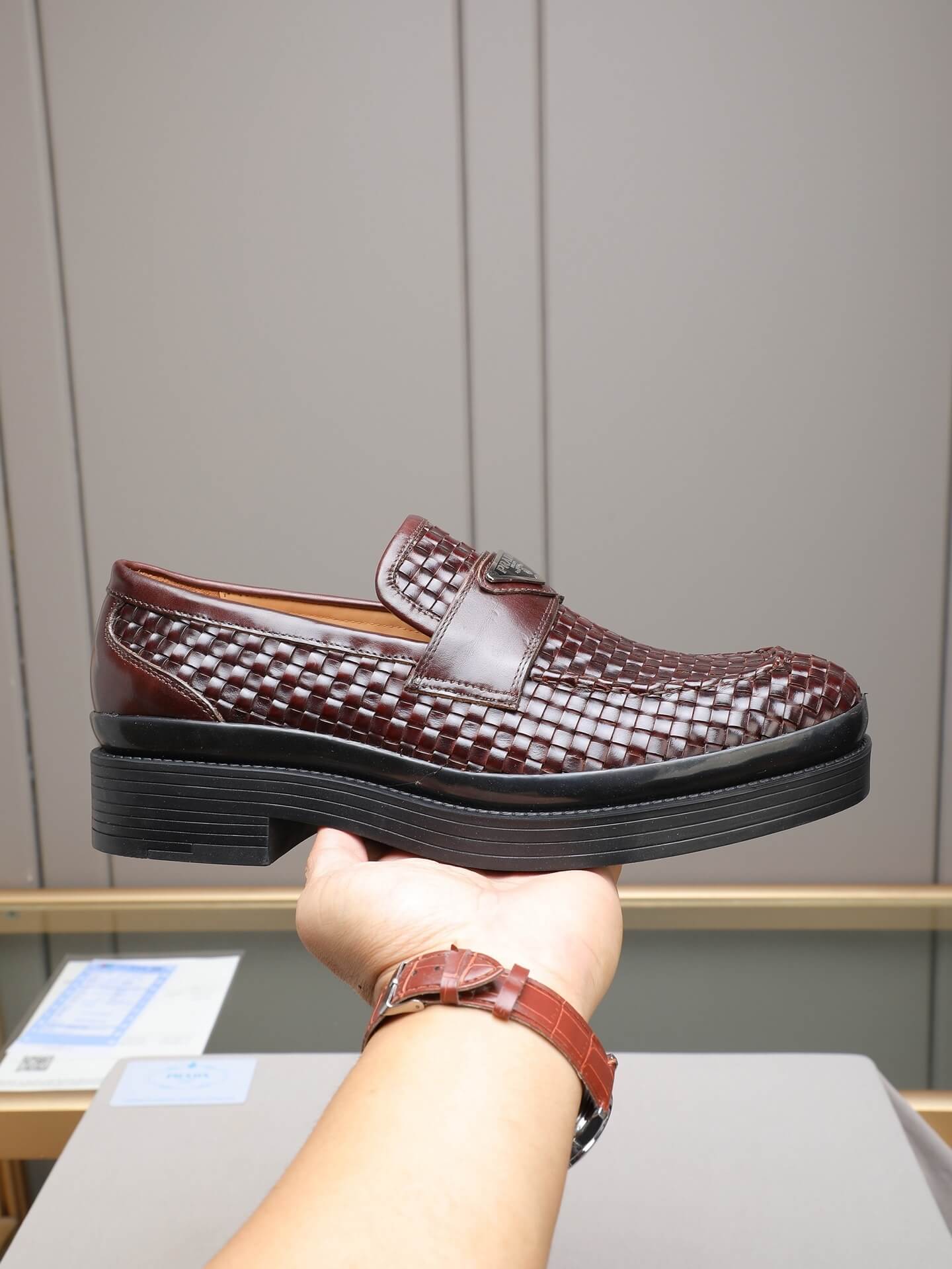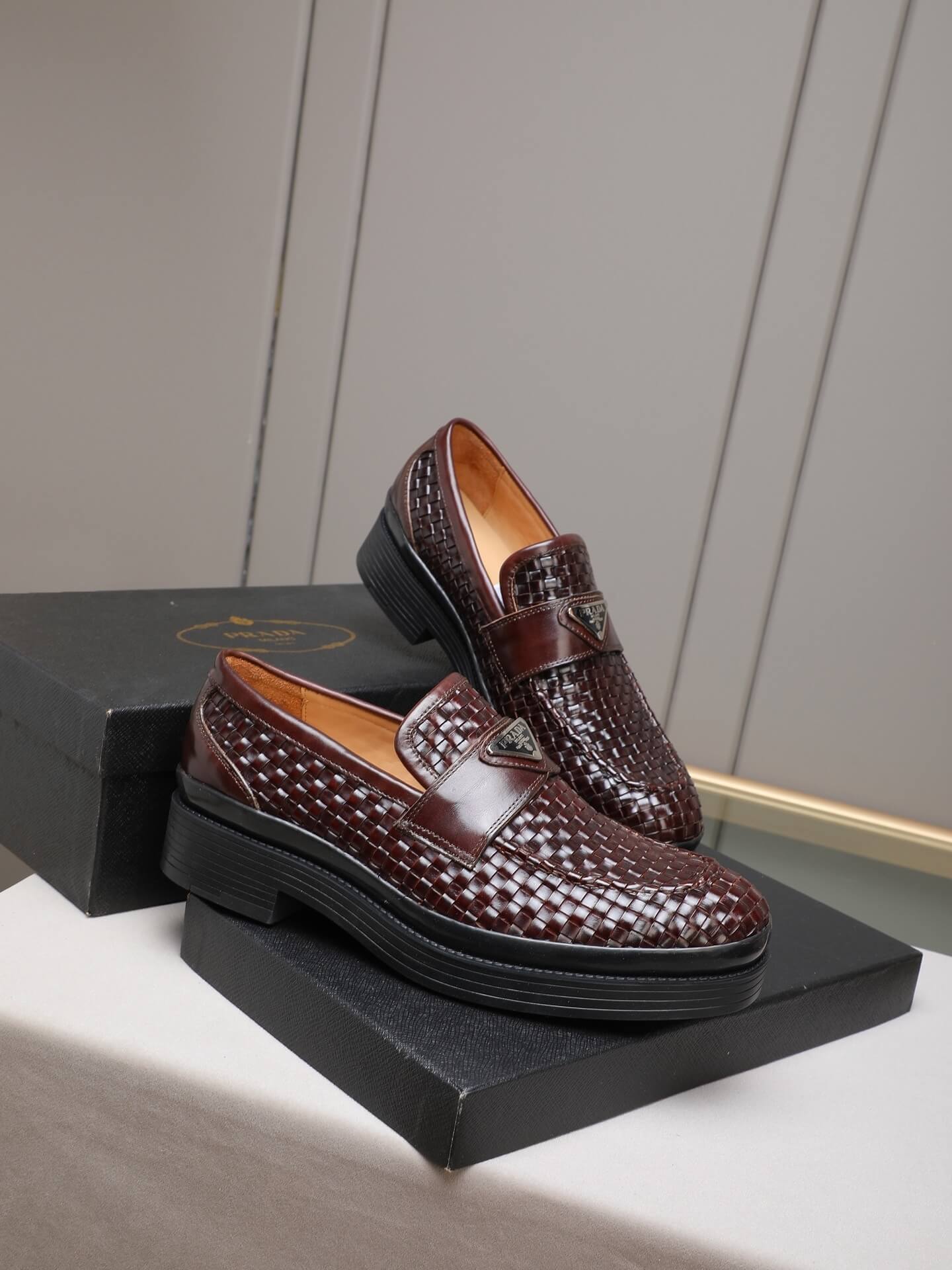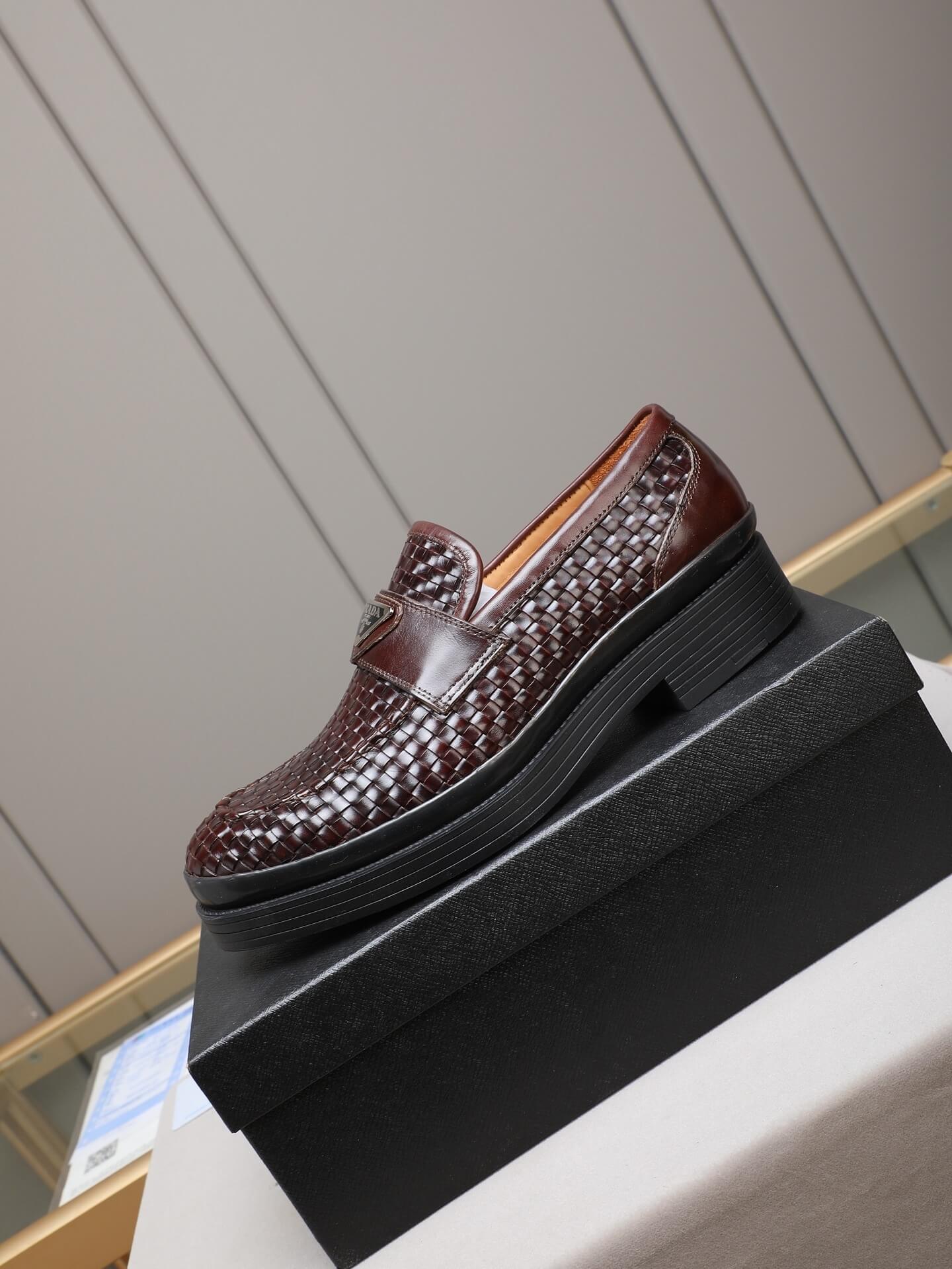 Redefine your style with the Prada Woven Leather Basket-Weave Lug Sole Loafer. This shoe is a masterclass in textural complexity and modern sophistication, taking the classic penny loafer silhouette and elevating it with rich materials and a bold structure. Crafted from dark, polished brown/burgundy woven leather, the shoe is grounded by a signature chunky black lug sole, perfectly encapsulating Prada’s blend of heritage elegance and sharp, contemporary design.
