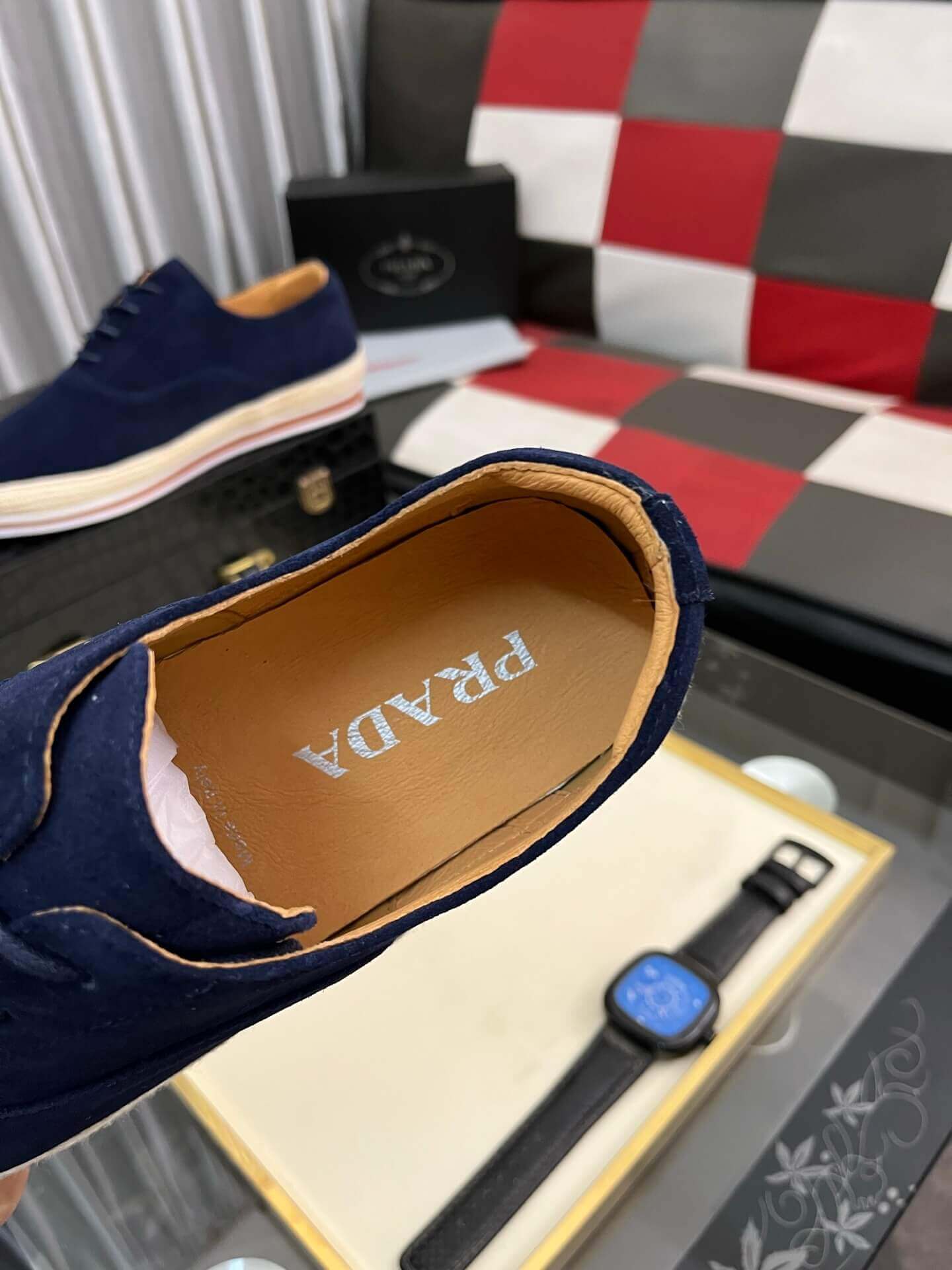 Elevate your casual wardrobe with these sophisticated Prada sneakers, blending luxurious materials with a unique design. The rich navy blue suede upper offers a soft, elegant texture, complemented by matching laces for a cohesive look. A tan leather lining provides premium comfort. The standout feature is the layered sole, combining a crisp white midsole with a distinctive braided jute outsole, adding an unexpected touch of artisanal flair. These lace-up sneakers are perfect for the discerning individual seeking a blend of classic elegance and contemporary detailing.