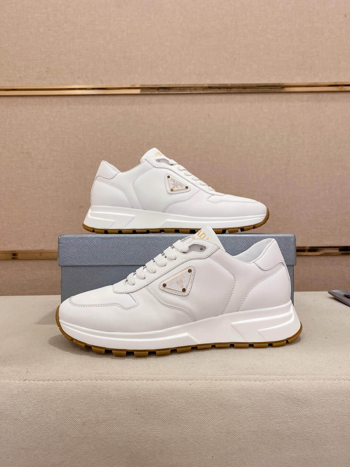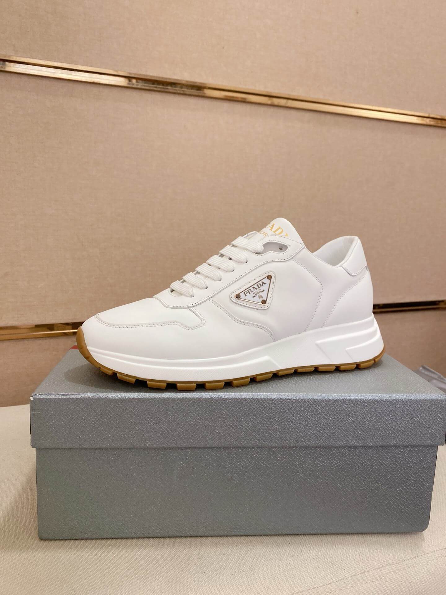 Make a bold statement with the Prada Prax 01 Leather Sneakers in White, a shoe that perfectly encapsulates the brand’s sophisticated and modern aesthetic. This highly desirable sneaker masterfully blends a classic white leather upper with a distinctive, chunky sole, creating a look that is both timeless and on-trend. It’s a statement piece that speaks to an appreciation for clean lines, innovative design, and the subtle power of a luxury brand.