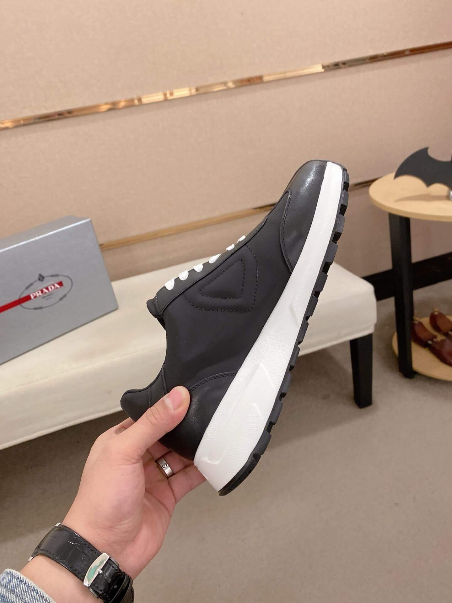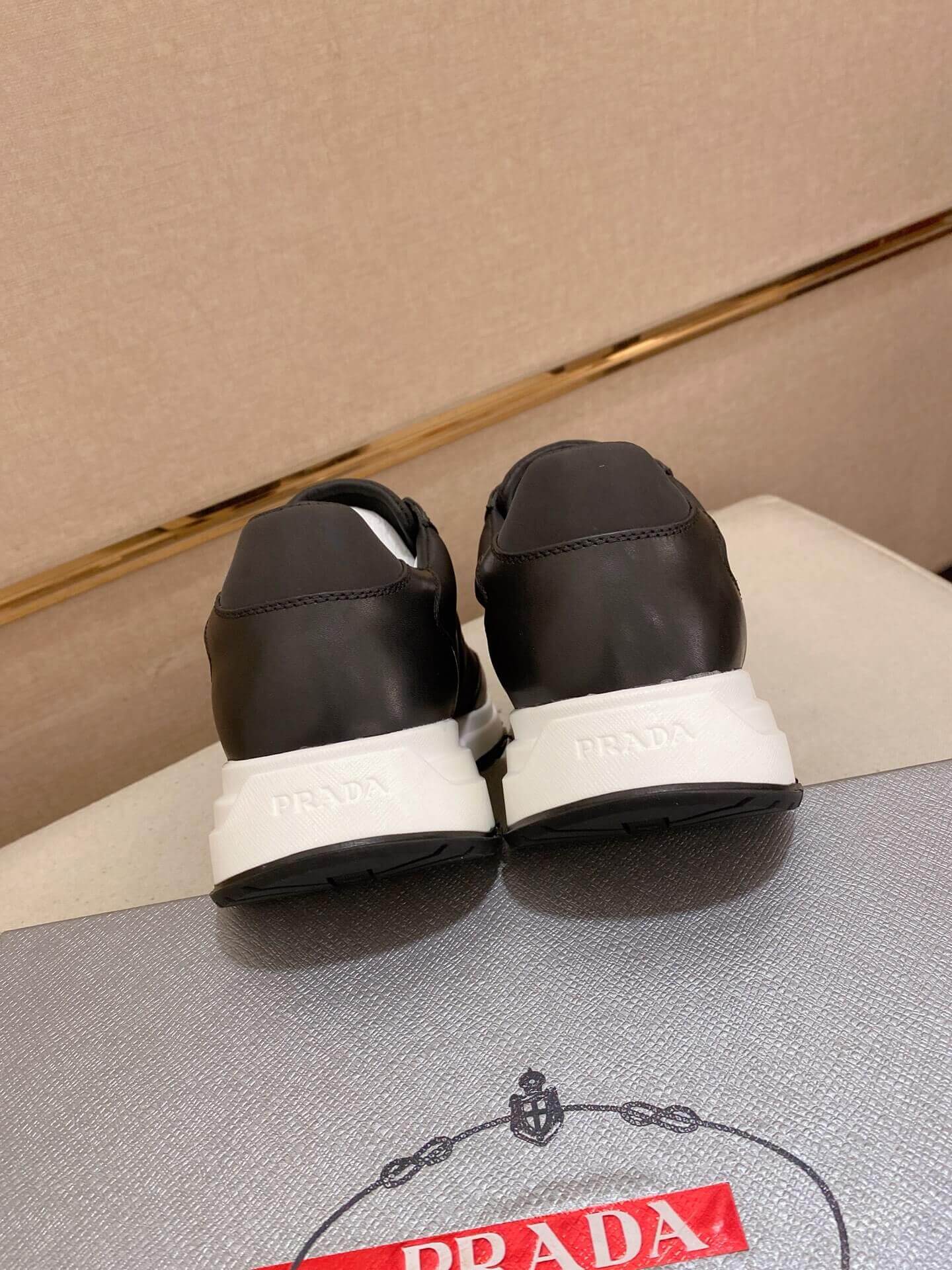 These Prada Prax 01 sneakers fuse minimalist aesthetics with striking modern details. Crafted from smooth black leather, the streamlined upper is subtly accented by a signature silver-toned Prada triangle logo, placed at the mid-foot for an iconic touch. The standout feature is the bold, sculpted white sole, which boasts an architectural profile that extends dynamically around the heel and provides a crisp contrast. White laces complete the contemporary look, making these sneakers a sophisticated choice for those who appreciate understated luxury and avant-garde design.