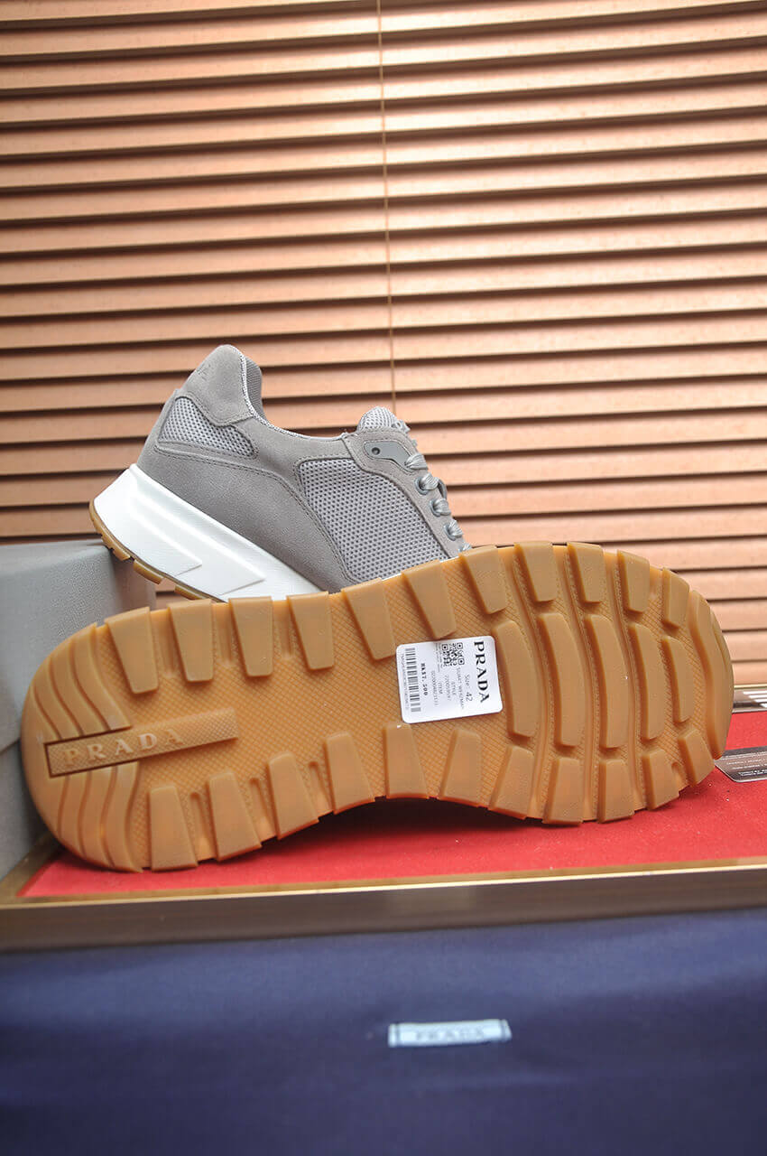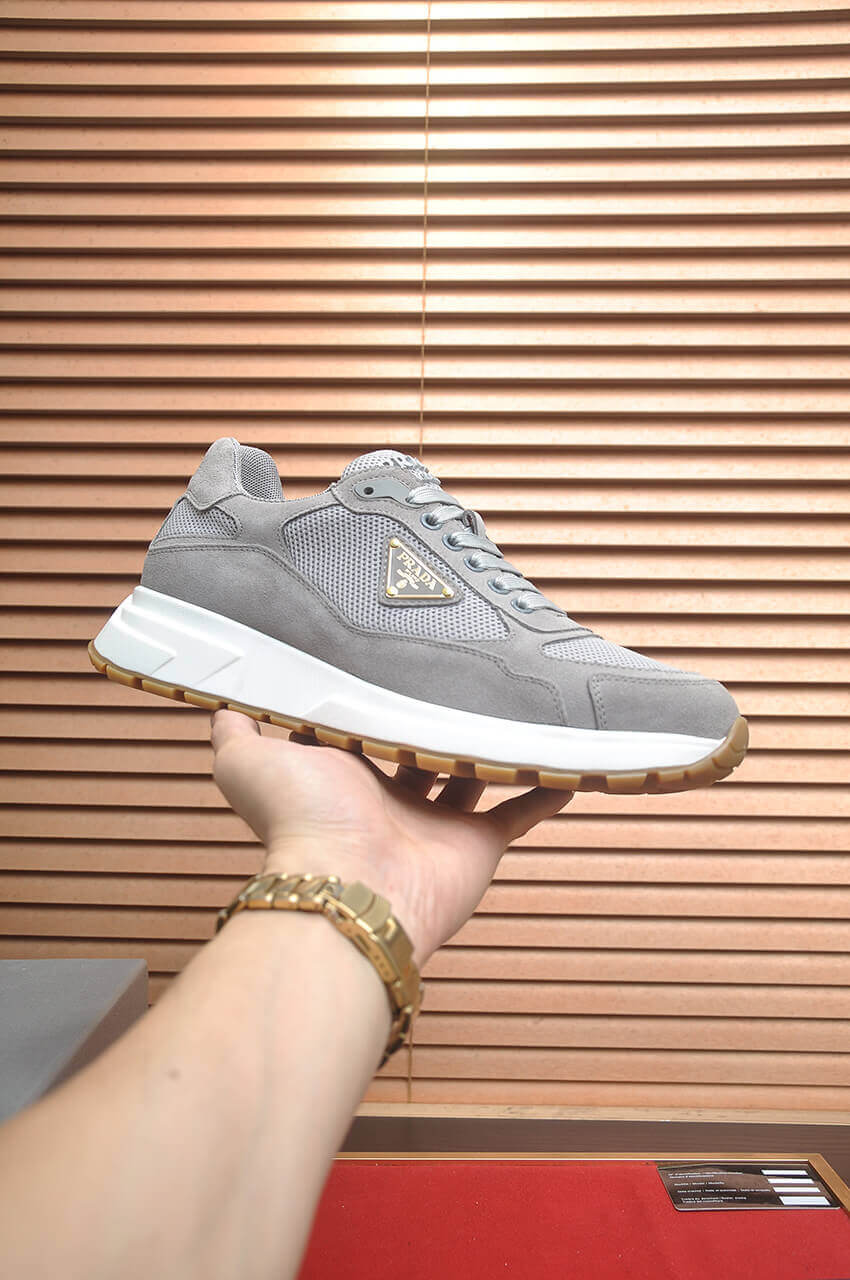 A perfect blend of high-fashion and technical design, the Gray Prada Prax 2.0 Sneaker is a modern classic. This lace-up sneaker is crafted from a dynamic mix of innovative gray Re-Nylon and soft suede, creating a rich textural contrast. The clean, versatile gray design is elevated by the iconic silver-toned enameled triangle logo on the side, a subtle yet unmistakable symbol of the brand’s heritage. The chunky, yet lightweight, white and gray rubber sole is both fashionable and functional, ensuring a comfortable stride and a bold, contemporary silhouette.