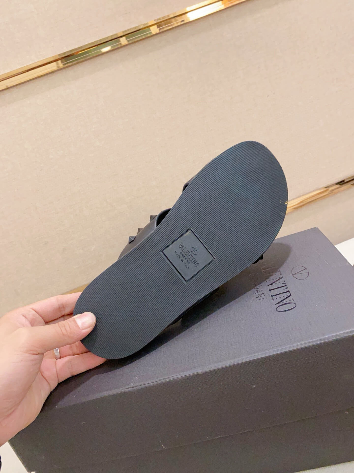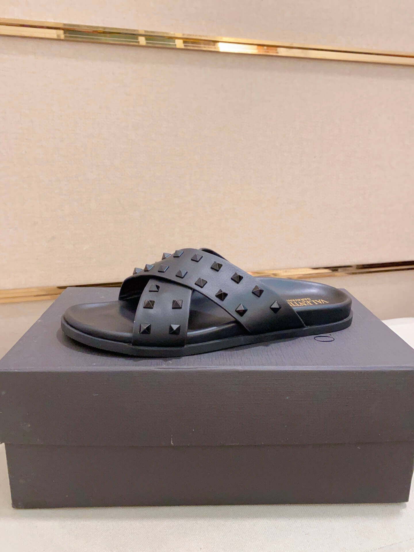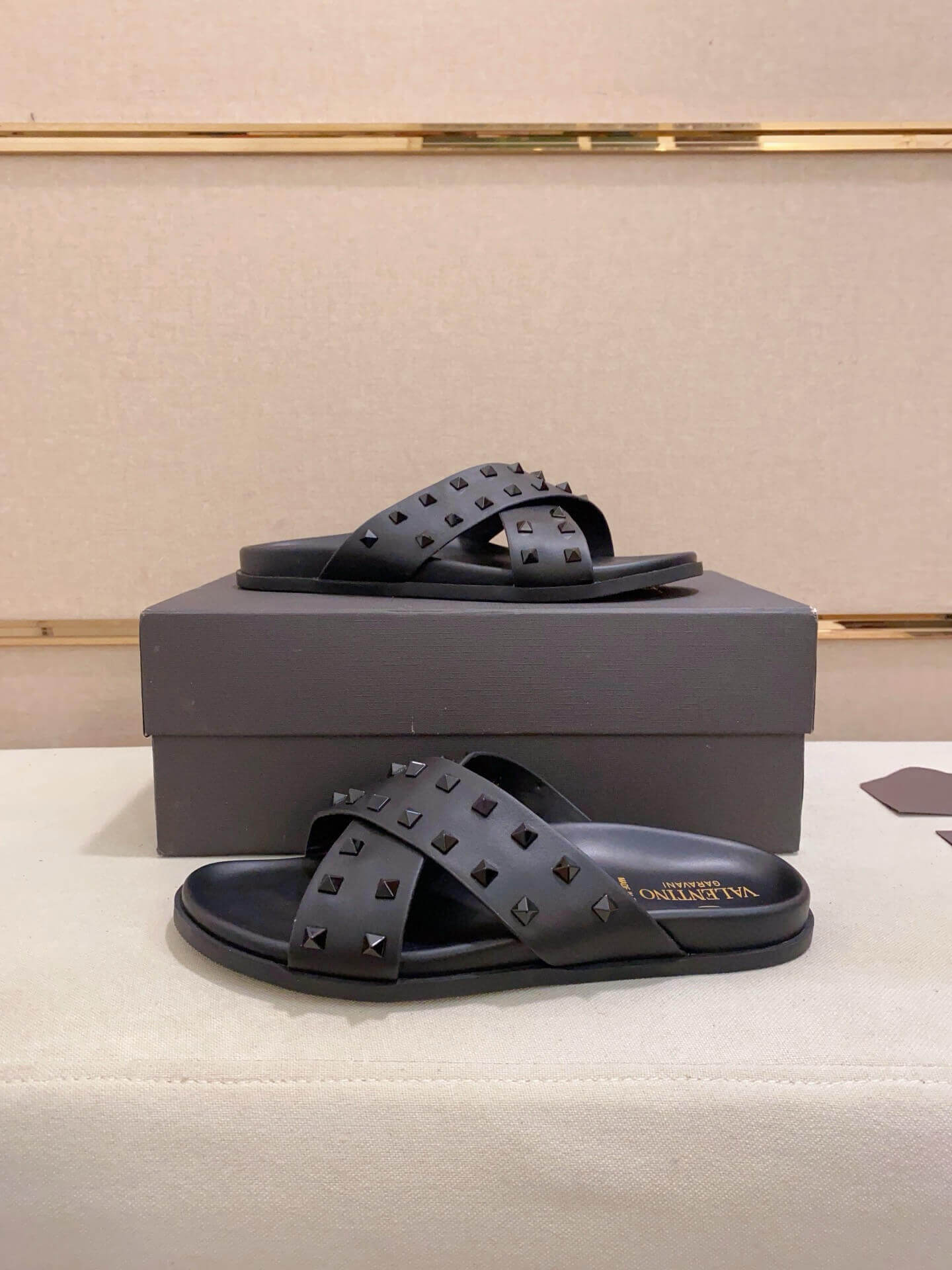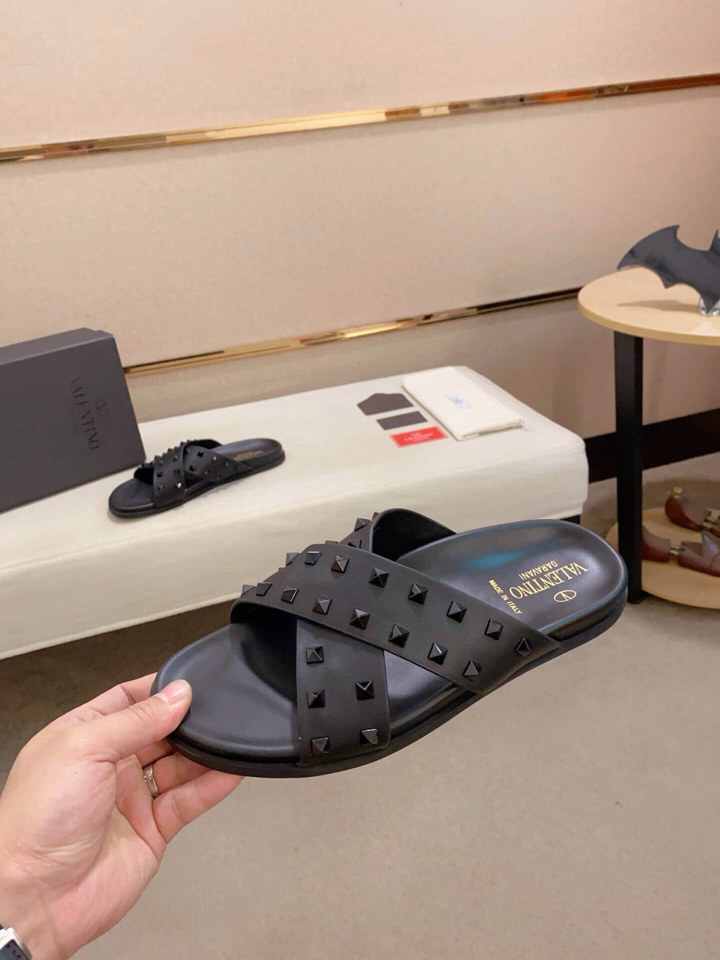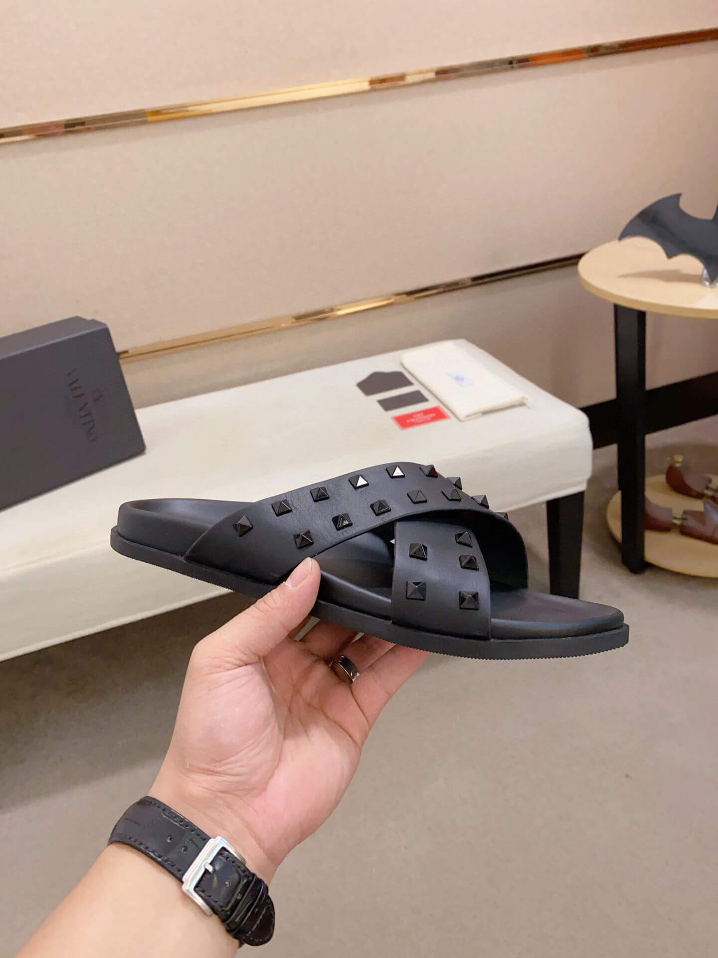 The Valentino Garavani Rockstud Sandal is a testament to the House’s audacious elegance. Crafted from supple black leather, the wide, crisscrossing straps are meticulously embellished with an array of black pyramid studs, creating a distinctive texture and an unmistakable edge. This iconic detailing transforms a classic slide silhouette into a statement piece, asserting its luxurious provenance with every glint. These sandals embody a confident sophistication that is uniquely Valentino.