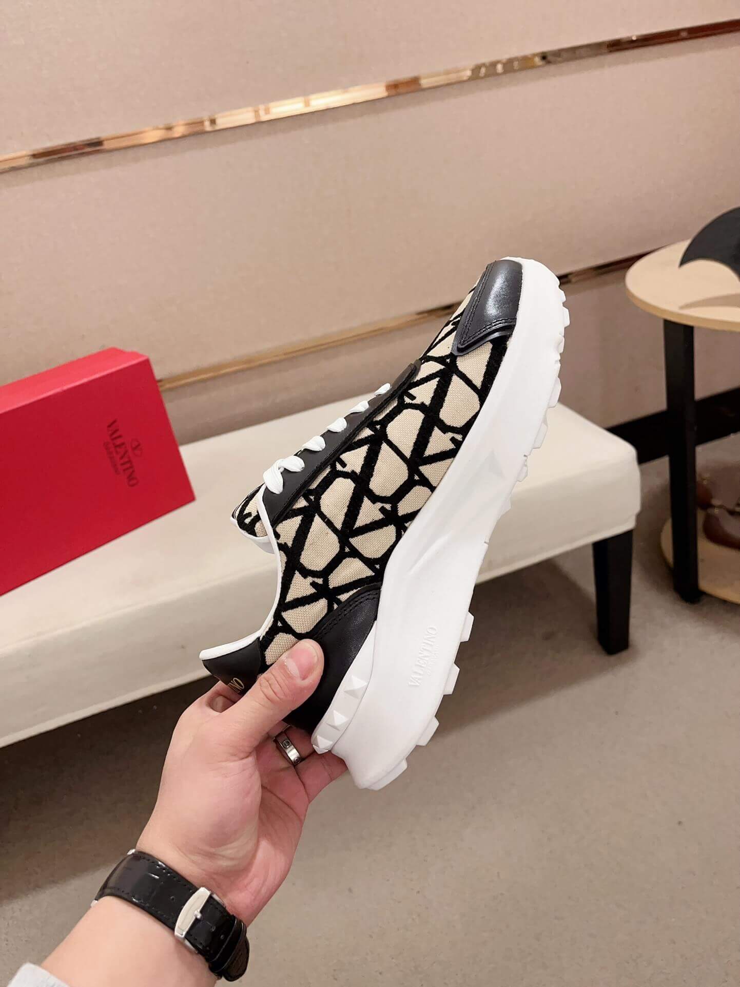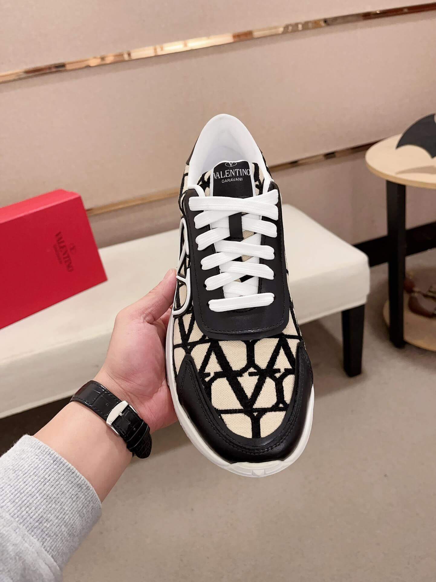 Step into a world of distinctive style with the Valentino Garavani True Act Low-Top Trainer. This striking sneaker features a dynamic upper crafted from black nappa leather, boldly contrasted with panels of Valentino’s signature Toile Iconographe fabric in beige and black, showcasing a captivating pattern. The design is further enhanced by white laces that intricately weave through the upper, framing the iconic VLogo Signature detail prominently displayed on the side. Resting on a chunky white rubber sole, this trainer offers a modern and assertive silhouette, perfect for those who seek a fusion of high fashion and athletic inspiration.