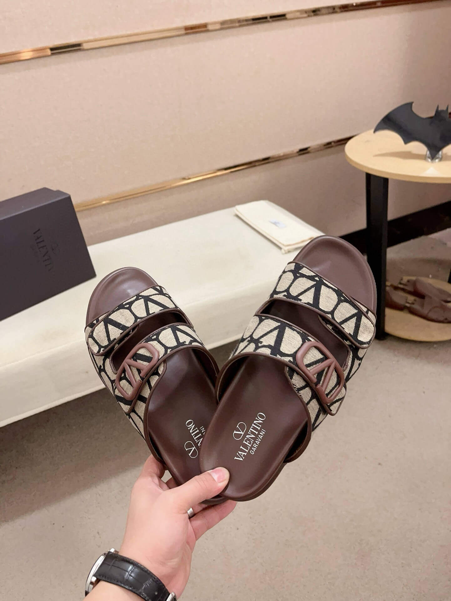 Elevate your casual ensemble with the Valentino Garavani VLogo Sandals, featuring Valentino’s iconic Toile Iconographe fabric in a sophisticated beige and black pattern. These stylish slide sandals are designed with two broad straps across the foot, the front one prominently showcasing the unmistakable VLogo Signature in a darker, coordinating tone, ensuring immediate brand recognition. The design is set on a comfortable brown molded footbed and a durable brown rubber sole, offering both ease and a distinctive aesthetic. Perfect for adding a touch of luxurious, patterned elegance to your warm-weather wardrobe.