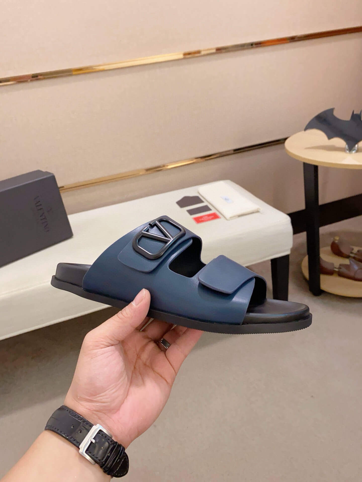 Embrace sophisticated comfort with the Valentino Garavani VLogo Sandals in a striking shade of blue leather. These stylish slide sandals feature two wide straps across the foot, the front one adorned with the unmistakable VLogo Signature in a darker, coordinating tone, ensuring instant recognition. The minimalist design is set on a comfortable black molded footbed and a durable black rubber sole, offering both ease and a modern aesthetic. Perfect for adding a vibrant yet luxurious touch to your warm-weather wardrobe.
