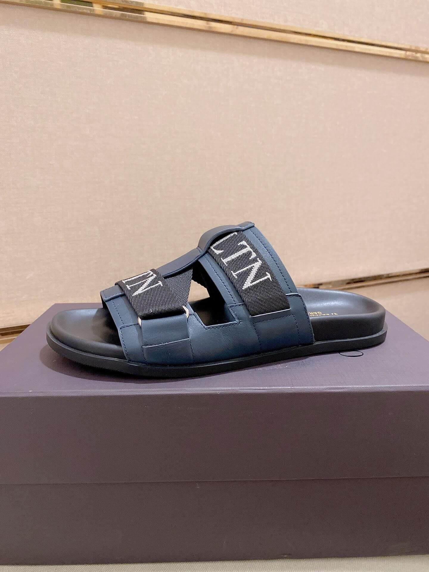 Command attention with the Valentino Garavani VLTN Sandals, expertly crafted from supple blue leather. These contemporary slide sandals feature two bold straps across the foot, each prominently displaying the iconic “VLTN” logo in crisp white lettering, ensuring immediate recognition. Designed for both comfort and a powerful aesthetic, they are set on a black molded footbed and a durable black rubber sole. These sandals are an ideal choice for those looking to infuse their warm-weather attire with an edgy, high-fashion statement.