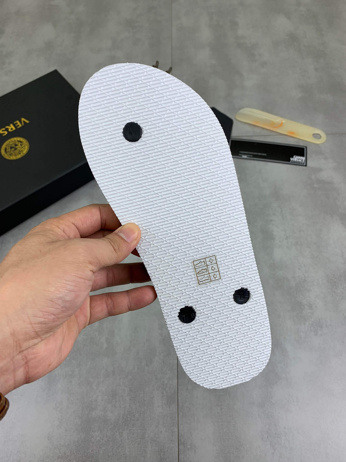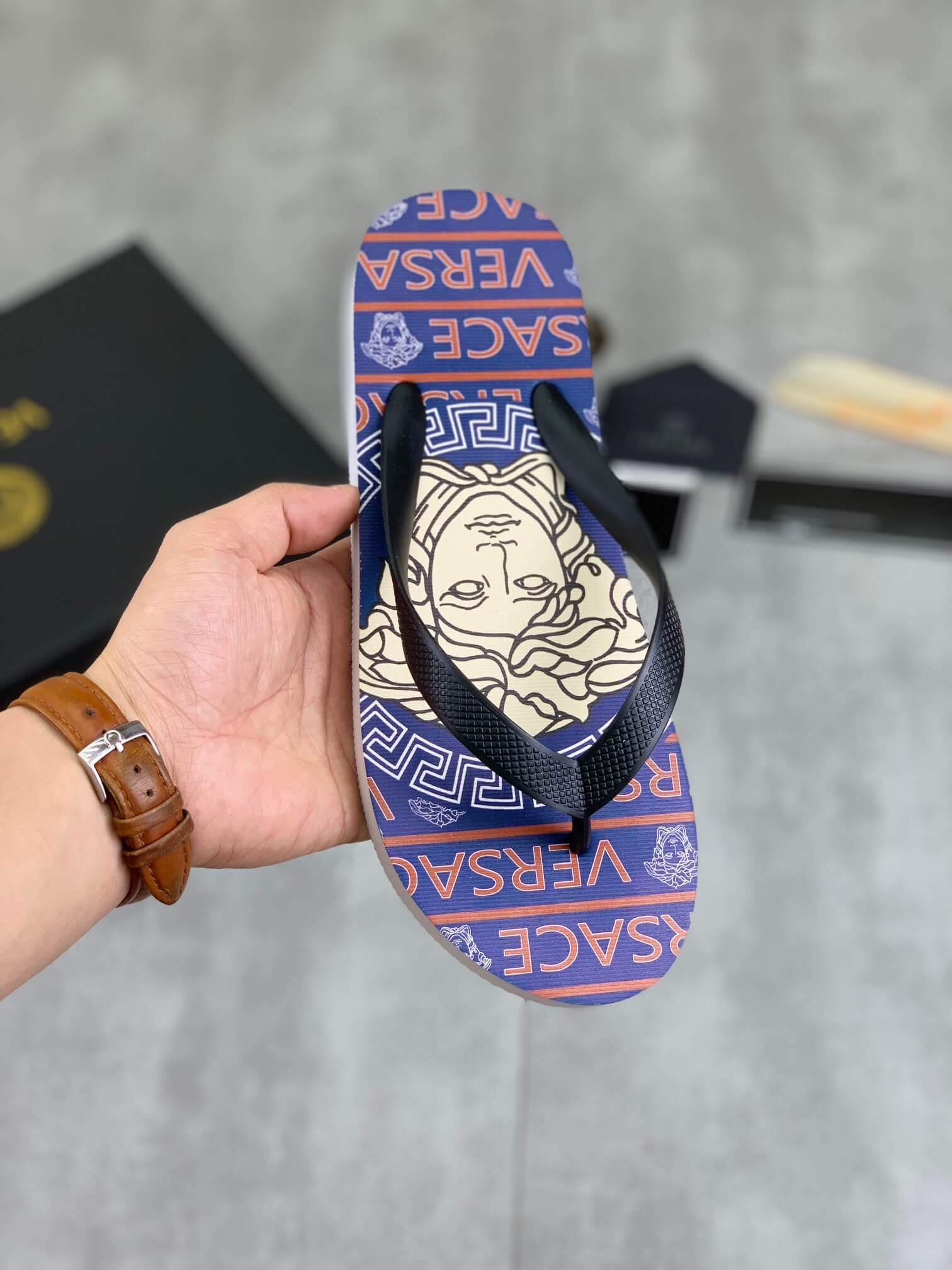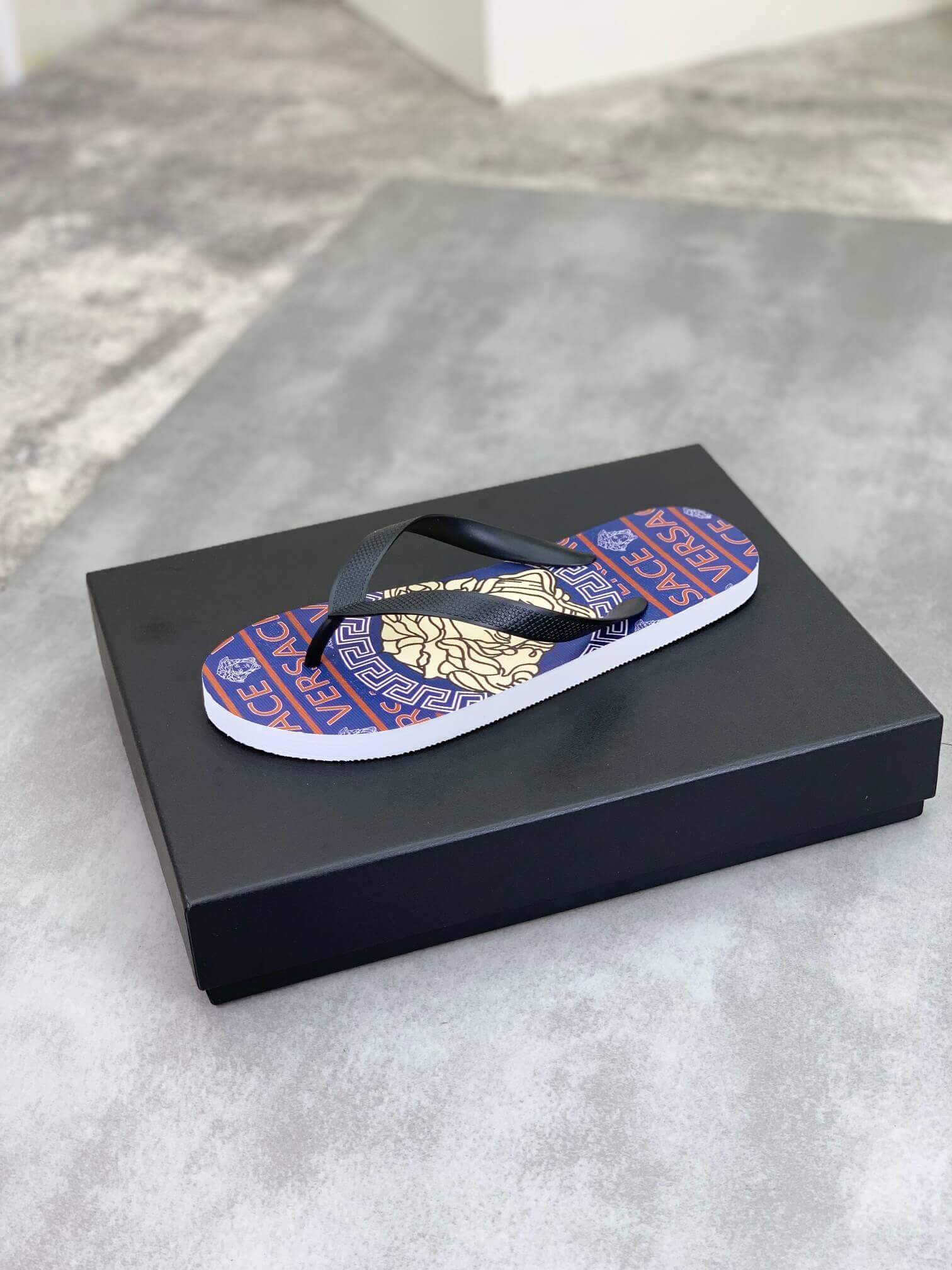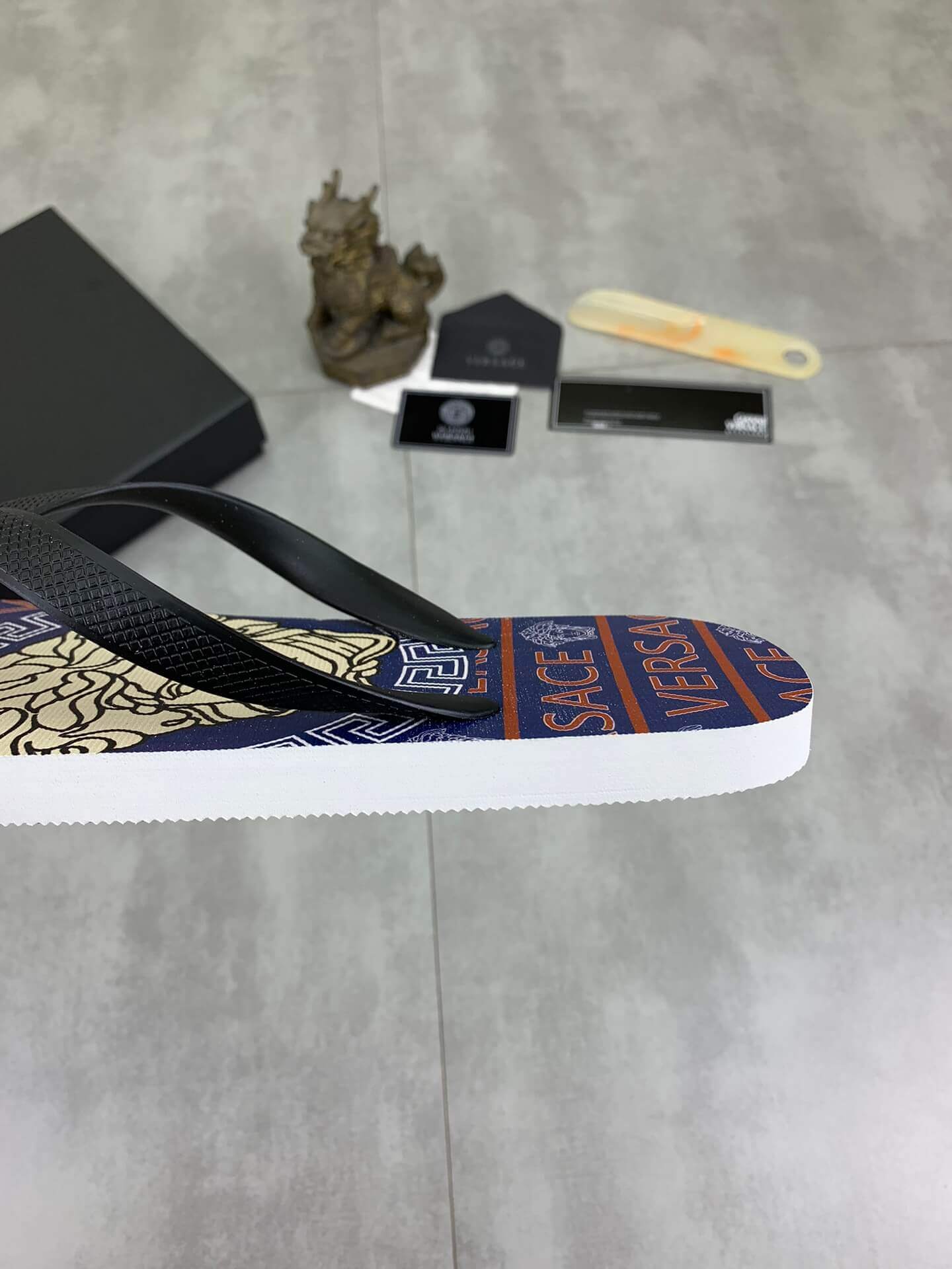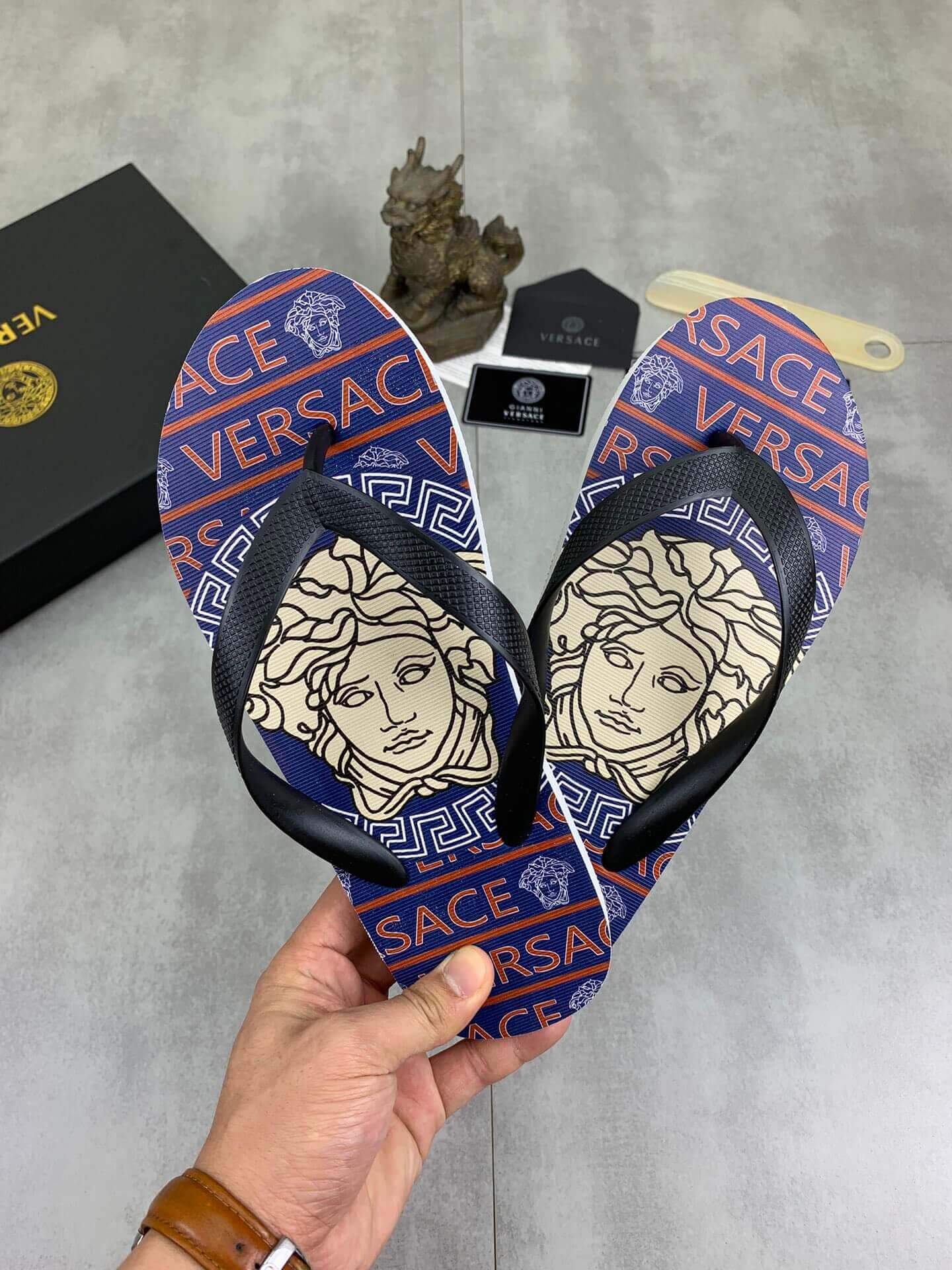 Dive into striking style with these vibrant Versace flip-flops. The footbed features an eye-catching pattern of interlocking geometric shapes and bold “VERSACE” lettering, all set against a rich blue backdrop with contrasting orange stripes. At the heart of the design lies the iconic Medusa head, rendered in a sophisticated beige and black outline. Equipped with comfortable black rubber straps, these flip-flops are a dynamic expression of luxury leisure, perfect for adding an unmistakable touch of Versace glamour to your casual look.
