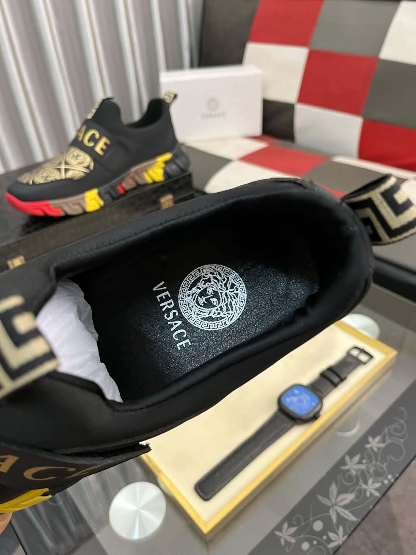- Striking Gold Medusa Accents: The black upper is adorned with prominent circular gold Medusa head motifs, offering an unmistakable touch of Versace’s iconic luxury and grandeur.